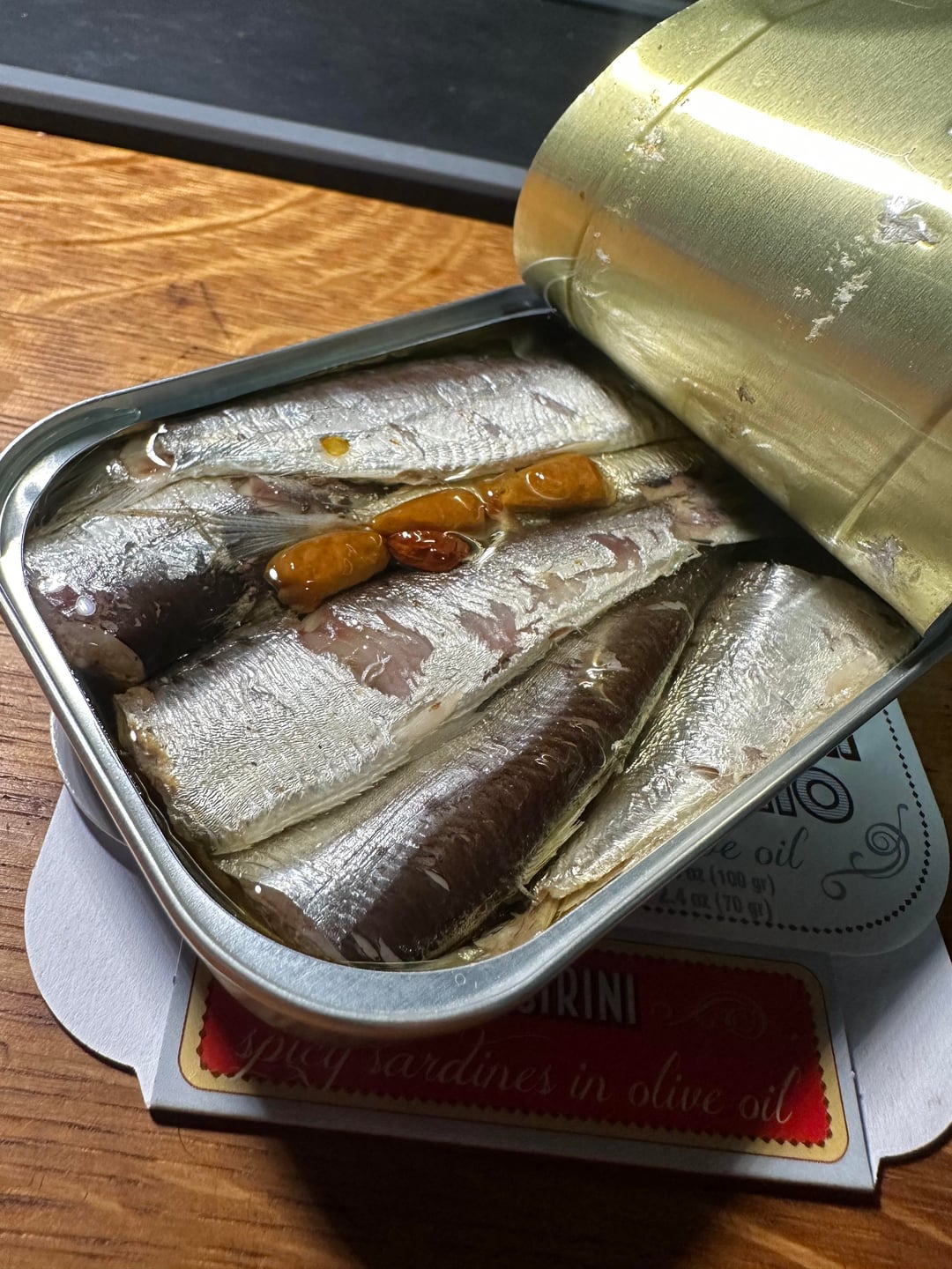 Aged Italian sardines. A 2023 vintage although I bet the highest price tins at Walmart have more age from sitting on the shelf than these. However they did have a different mouthfeel, with the body flaking apart at the spine and the meat taking the same richer colors like a dry aged beef tends to. As far as the “misunderstanding” I often forget that spicy outside of the US can mean more than heat and scoville units. These aren’t so much as heat as flavor. They claim olive oil chilis and salt but it was more than just heat. Great flavor and dimension.
