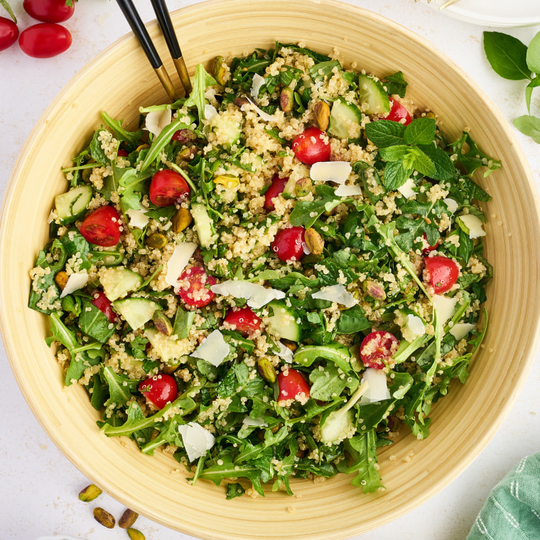This colorful salad is the definition of fresh. Fluffy quinoa is tossed with sweet tomatoes, crisp cucumbers, peppery greens, fragrant herbs, shaved Parmesan and crunchy pistachios, all coated in a bright lemony dressing. It’s refreshing, filling and makes a fabulous side dish or light main. Plus, it holds up great for meal prep.