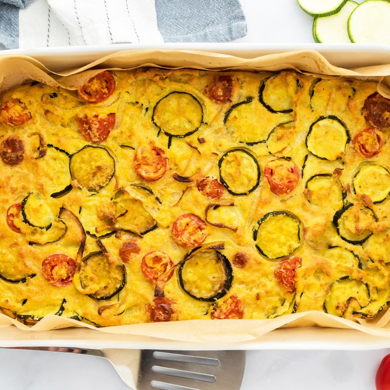Meet your new favorite way to use up zucchini! Scarpaccia is a traditional Italian dish that’s part pancake, part veggie-packed loaf. Zucchini, onion and cherry tomatoes are folded into a cornmeal-almond flour batter (yes, this recipe is gluten-free!), then baked into a golden, rustic cake. It’s hearty, nourishing and absolutely delicious — warm or cold. It’s a unique and beautiful addition to your summer table.
