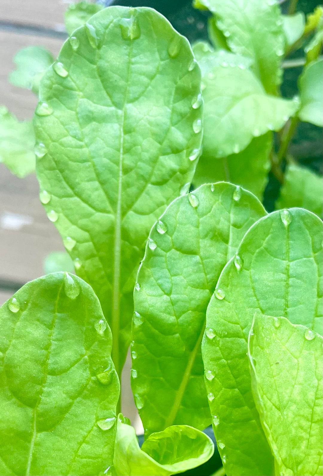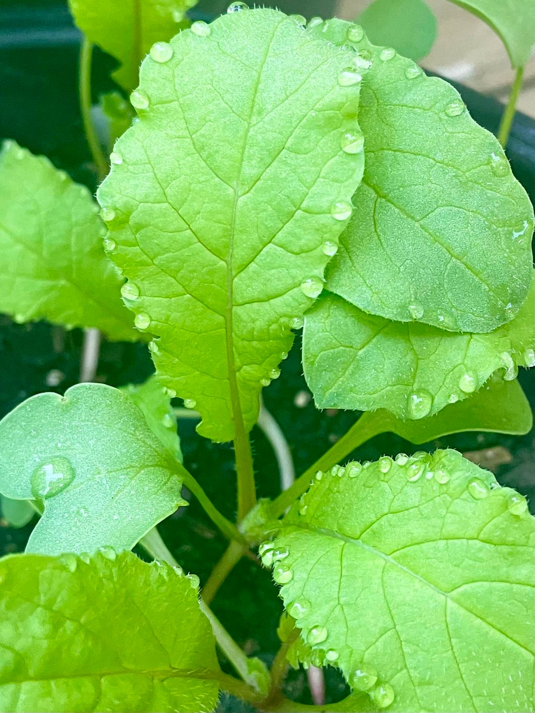 Morning dew on my radish are looking great this morning and wanted to share. Cheers!