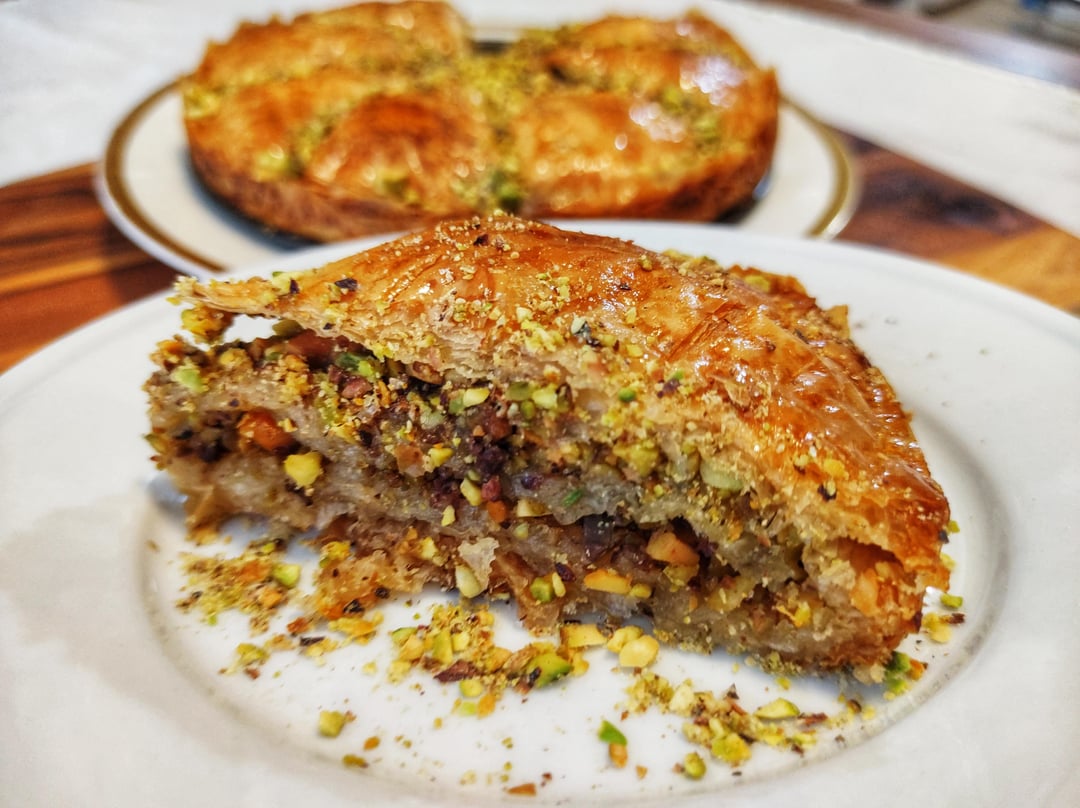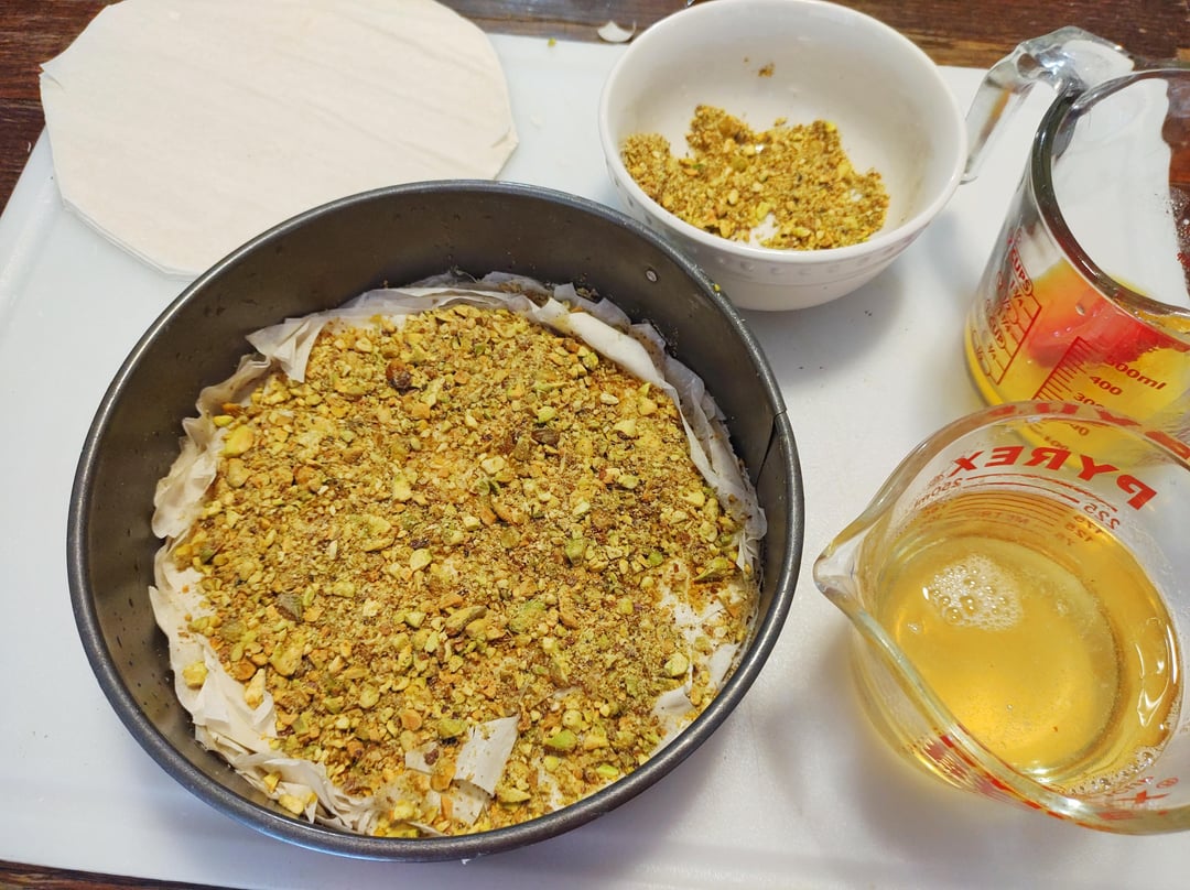 Vegan ingredients: Phyllo dough, pistachios, simple sugar syrup with rose water, lemon juice, vegan butter, and spices. Layer sheets of phyllo, brush them with vegan butter, and add the chopped nuts. Layer with more phyllo, cut, and then add the sugar syrup. Bake at 325°F until golden brown on top. It's supposed to be better to let it rest for a few hours, but who are we kidding? Eat it all warm from the oven and don't share it with anyone. You made it, it's yours 🤗