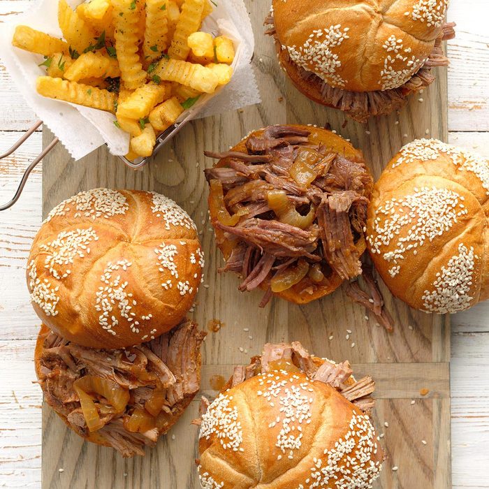 I have fond memories of my mother in the kitchen preparing her amazing beef dip sandwiches. They always made our house smell like an Old World Italian restaurant. And as good as the aroma was, somehow the taste was even better! Set out a jar of giardiniera for spooning on top. —Kira Vosk, Milwaukee, Wisconsin