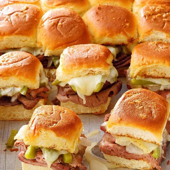 These Philly cheesesteak sliders are a wonderful way to use leftover roast beef, but using sliced roast beef from the deli also works. —Debra Waggoner, Grand Island, Nebraska