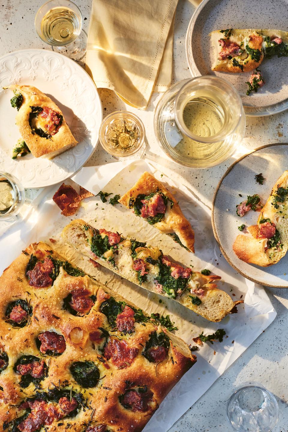 In this rustic focaccia, the combination of blanched kale, spinach, and rocket with smoky scamorza cheese and Italian sausage creates a bread that’s both comforting and vibrant — perfect for sharing as the evenings grow cooler.