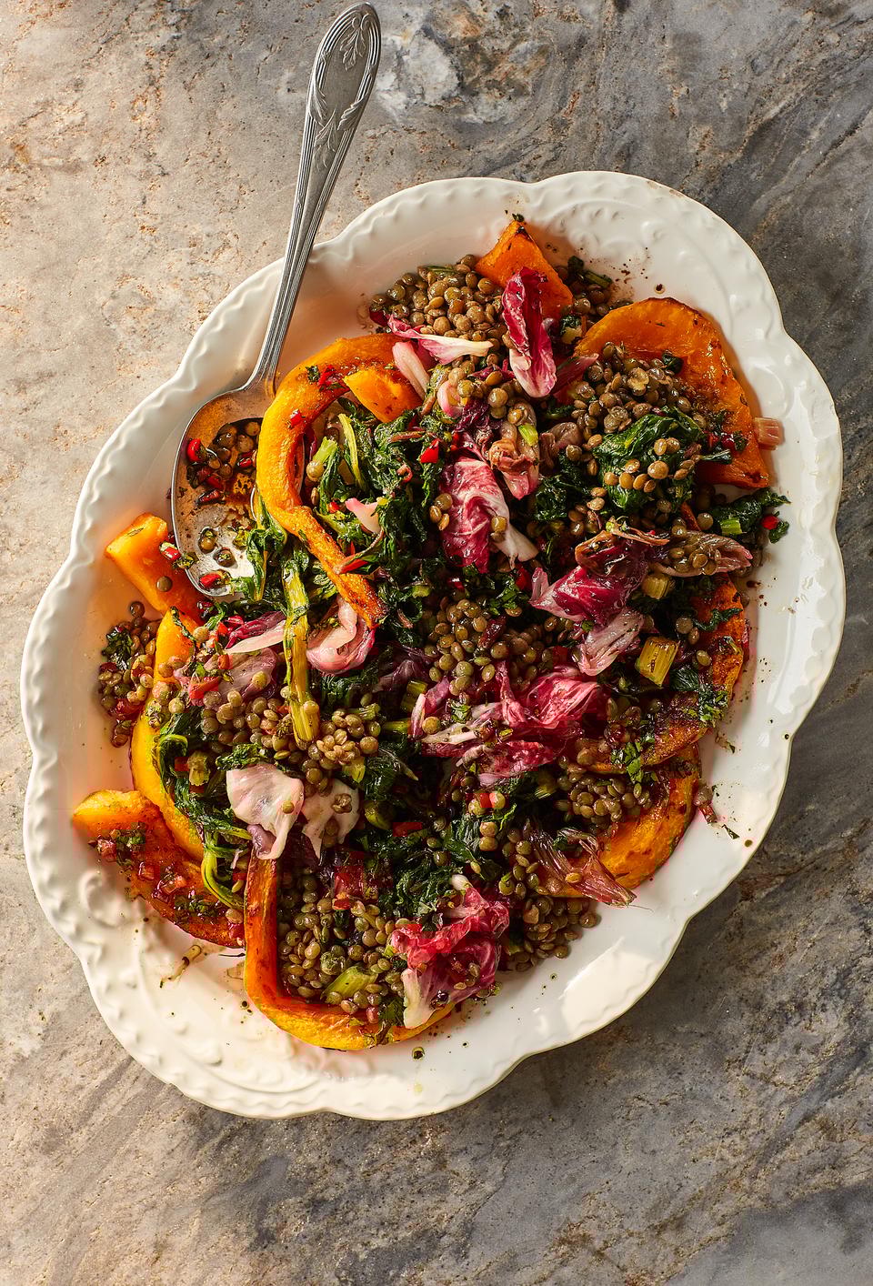 1 medium size onion squash, peeled, cut in half and deseeded 2 heads radicchio 100g lentils, De Castellucio or Puy 500g rainbow chard stems, cut in to 2cm pieces and leaves cut in to 4cm slices 1 tsp thyme Juice of half a lemon 1 clove garlic, finely chopped 2 tbsp extra virgin olive oil 1 tbsp balsamic vinegar3 tbsp extra virgin olive oil 1 tsp chopped parsley 2 red chillis, deseeded and finely chopped Preheat oven to 180ºC. Cut the onion squash into 2cm half-moon wedges and place in a large bowl with 2 tbsp extra virgin olive oil, chopped garlic, salt and pepper. Mix well and lay the squash flat on to a roasting tin lined with greaseproof paper. Cover with tin foil, ensuring there are no gaps, place in the oven for 35 minutes. Remove the tin foil and turn over the squash. Cook for a further 10 minutes, so the squash gets a nice golden colour and goes slightly crispy. Take out of the oven and leave the squash to cool down. In a pan of boiling salted water, add the radicchio leaves and cook for 3 minutes after the water has come back to the boil. Drain into a colander and leave to cool down.Take a large clean tea towel and place the cooked radicchio leaves on it, roll into a sausage shape and squeeze gently, so the radicchio becomes dry. In a pan of boiling salted water, add the rainbow chard stems and cook for 2 minutes, add the rainbow chard leaves and cook for a further 3 minutes. Drain the pan into a colander. Leave the chard to cool down. When cool, take a few sheets of kitchen paper and push down on the rainbow chard and stalks, so excess water is released. In a large bowl mix the squeezed radicchio and rainbow chard together with salt pepper and 2 tbsp of extra virgin olive oil and the juice of half a lemon. The radicchio will change colour to a bright crimson when the lemon juice touches it. Cook the lentils in a small sauce pan, cover with 5 cm of water. Cook for 20 minutes or until the lentils are tender and have a little bite. Drain and season with salt and pepper, keep to one side. Serve the dish warm by heating up the squash and lentils and warming the chard and radicchio. Place the squash on the bottom of an oval or large round plate then scatter over the rainbow chard and radicchio and then the warm lentils. Drizzle all over the chilli, parsley, balsamic and olive oil sauce and serve in the middle of the table to share.