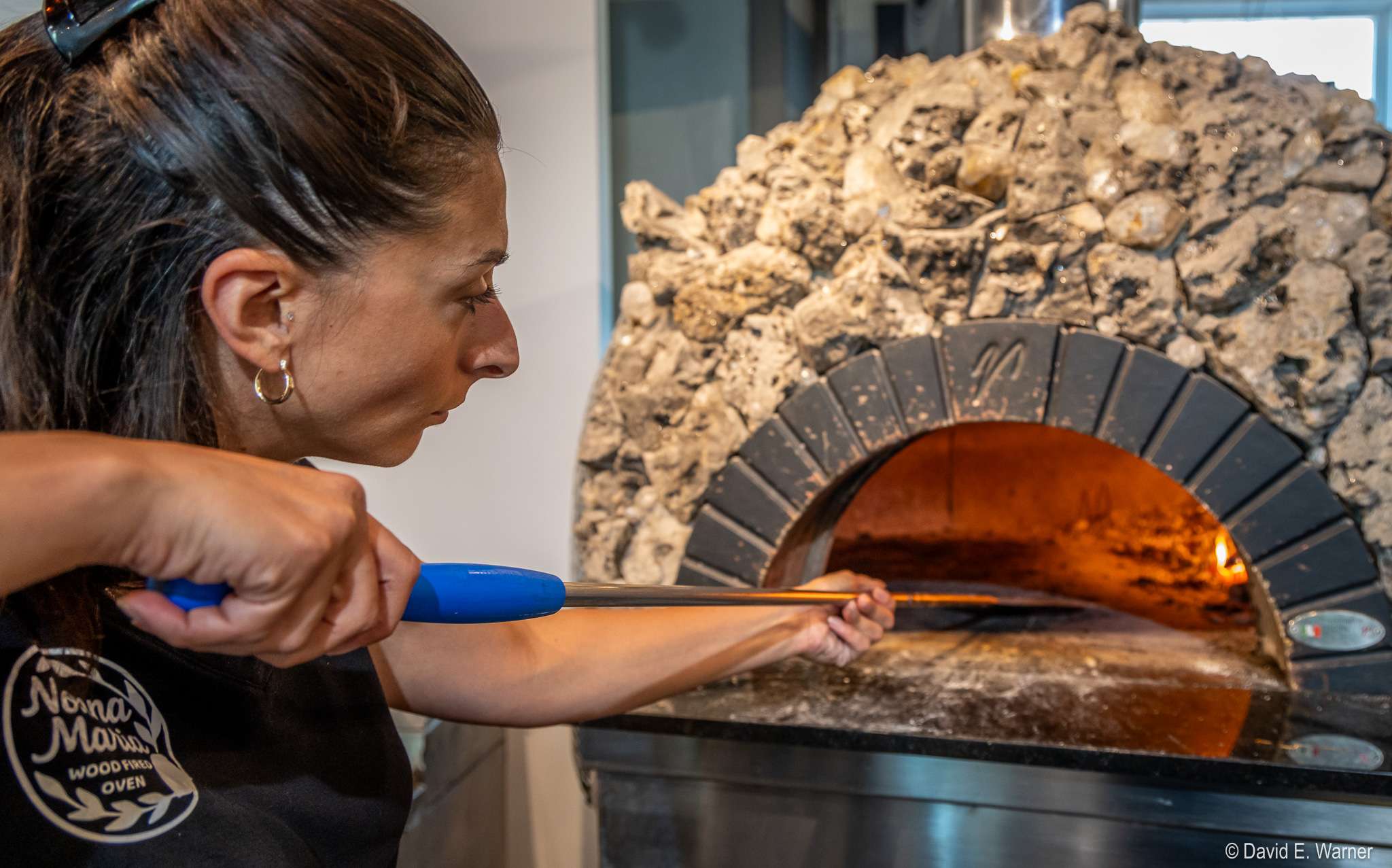 Marica Bellico puts a pizza into the oven at the new Nonna Maria’s in Little Falls.