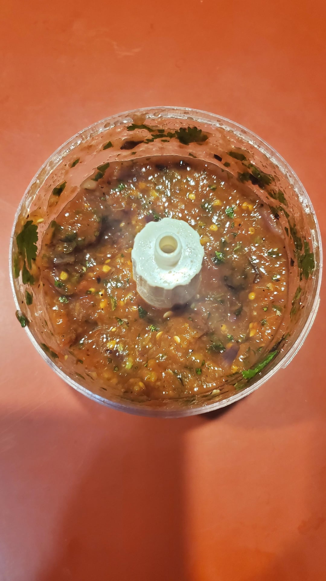 Home grown tomatoes, home grown wax peppers, red onion, garlic, cilantro, lime juice, touch of salt. It's wasn't very spicy st first bit when I stopped eating them about 30 sec later it started hitting me and then a minite later I was sweating. Very good spice level for me. Next time I would add a little less cilantro and a bit more tomatoes. Good thing I got plenty more for another batch or 2!