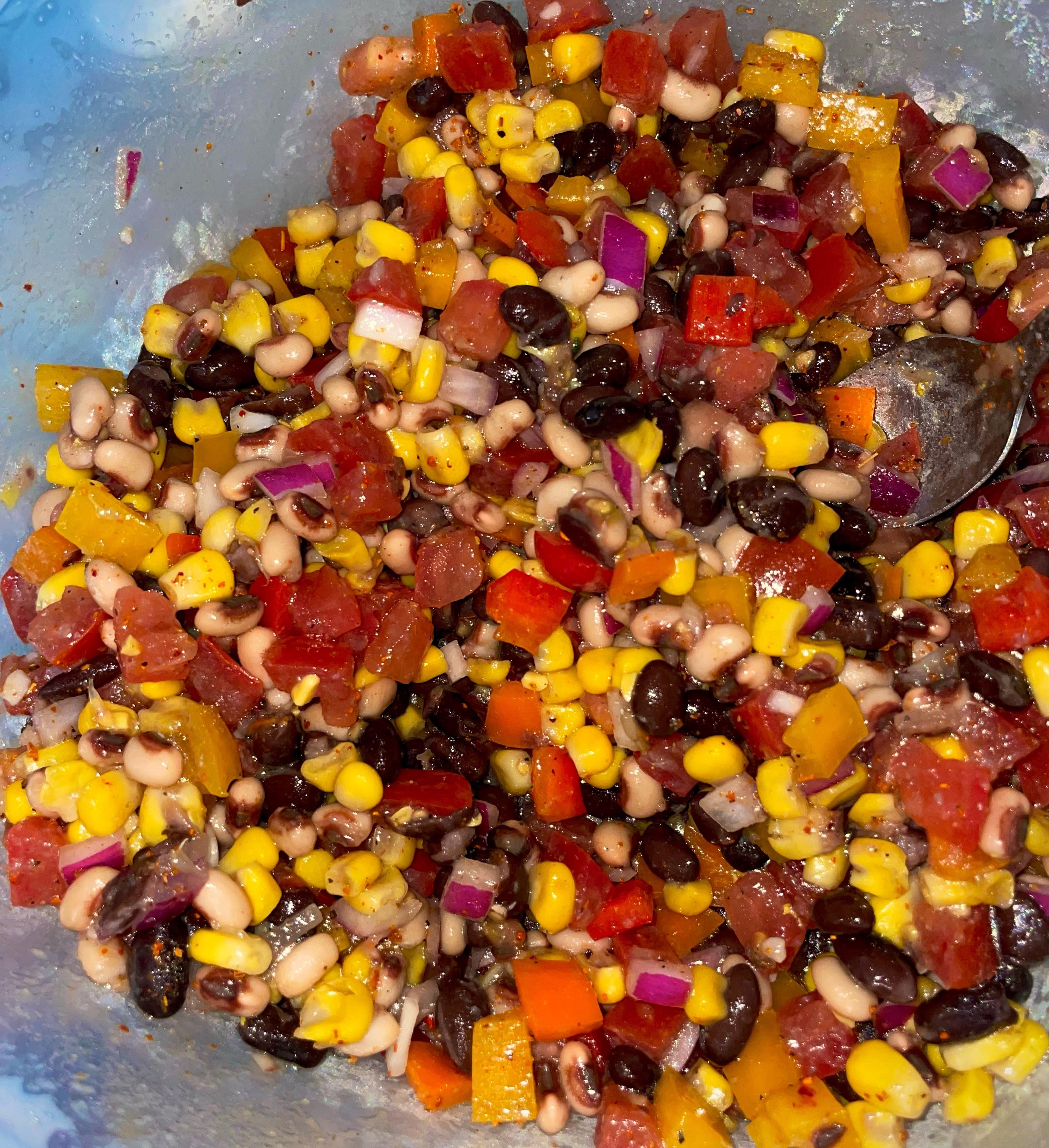 mozzabella98 2 months ago Black beans, black eyed peas, corn, roma tomatoes, bell peppers, red onions, olive oil, red wine vinegar, tajin, juiced lime, salt, pepper