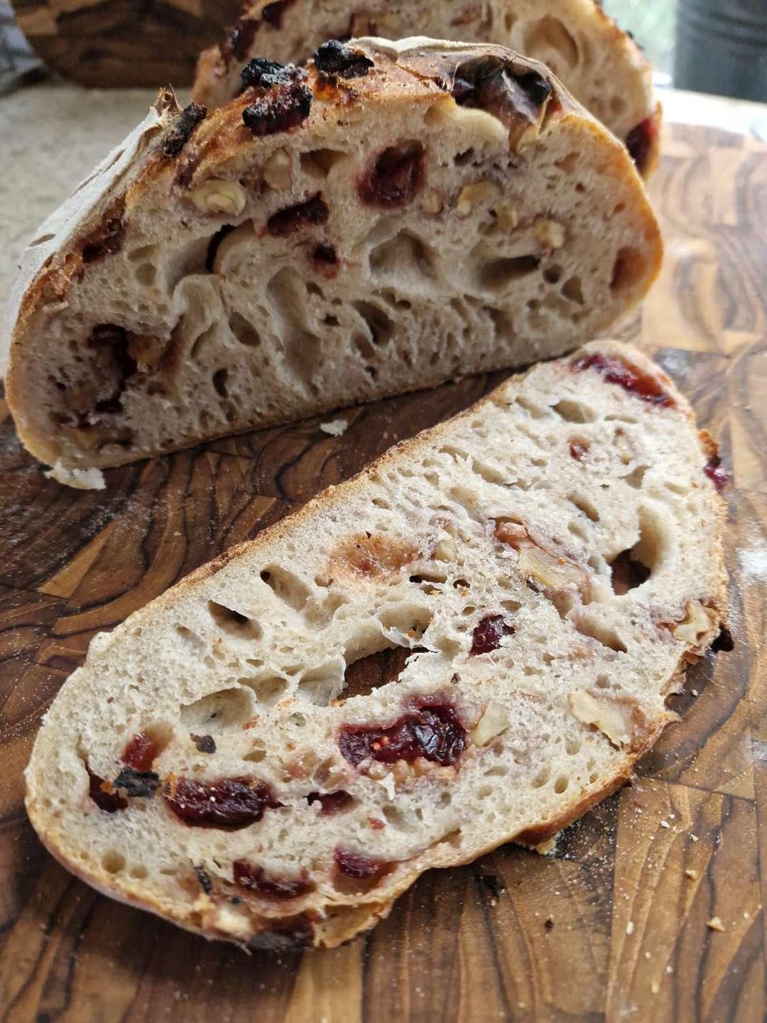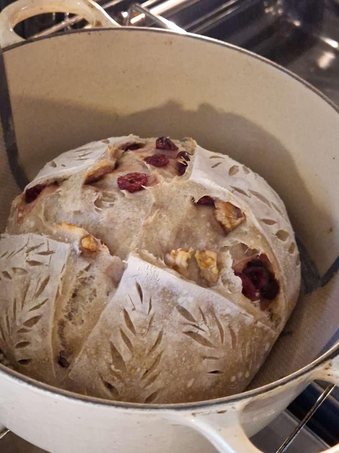 This was my first attempt at adding berries as an ingredient. I chose dried cranberries instead of raisins—just a personal preference—and added walnuts, which I love in bread. I saw that some people add the nuts and berries during the folding stage, but I added them during the final shaping.