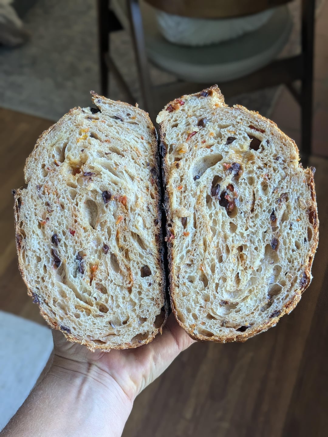 I used Maurizio Leo's recipe that can be found here : https://food52.com/recipes/83727-olive-sourdough-bread-recipe-with-sun-dried-tomatoes