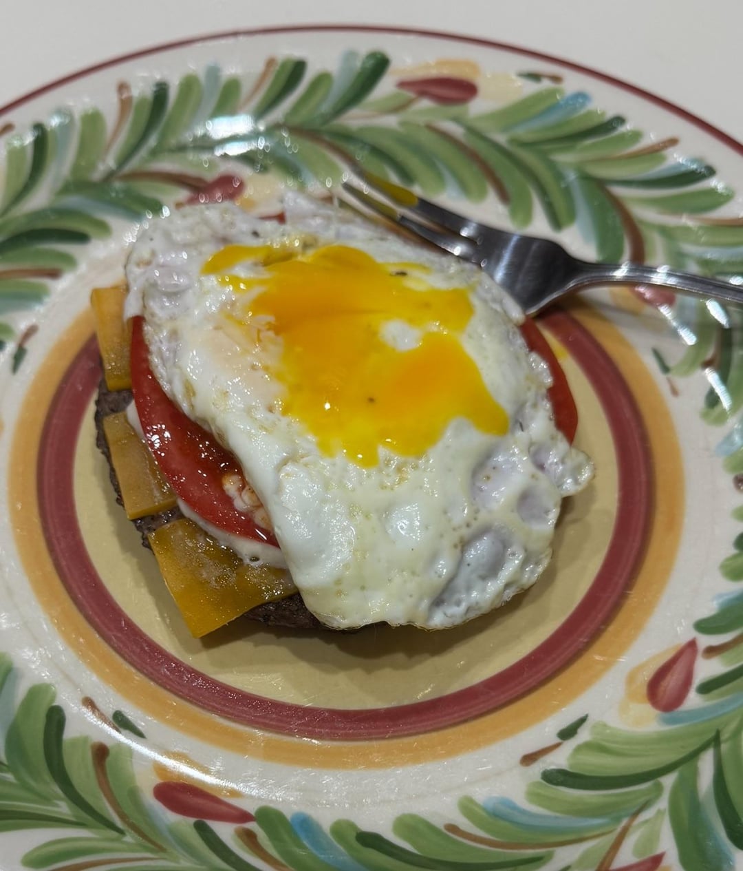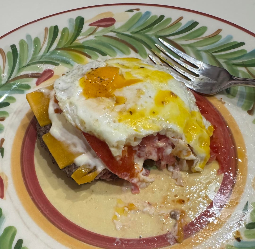 My goto lunch or dinner here. Grass fed flame cooked ground beef burger from the grill with a sun ripened garden tomato, lathered with homemade mayo, sliced medium cheddar cheese, and topped with a fried egg (from pasture raised chickens.) Also had a dash of Hatch red chile sauce and a side of avocado. Slurp. Try it. You will not be disappointed.