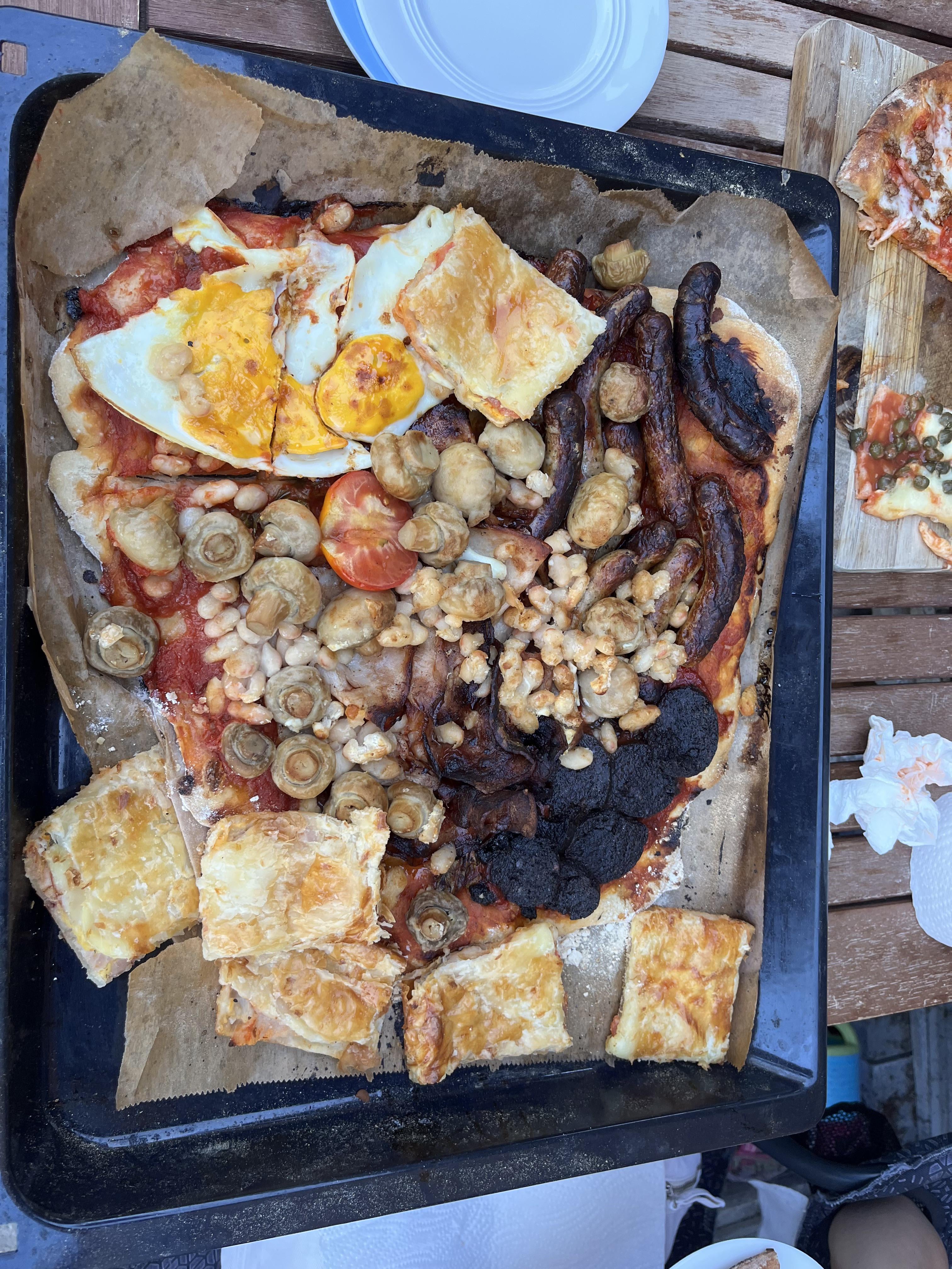 A full english pizza can work smattering of scrambled egg, sausage, bacon bits, black putting, mushrooms, and a tomato base. This… is an abomination.