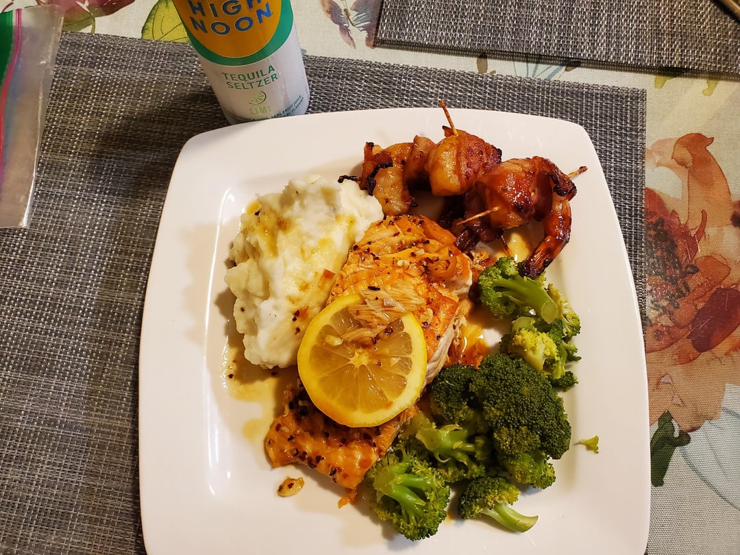 Honey Glazed Salmon, Bacon wrapped BBQ Shrimp, Mashed taters & some green stuff by live-learn-69-420 3 Comments MagazineDelicious151 1 month ago Looks delicious. smashingpumpkins21 1 month ago Love it but gotta throw cream cheese with the bacon wraps its a must poetichor 1 month ago *gollum voice, trepidatious* What’s…*taters*?