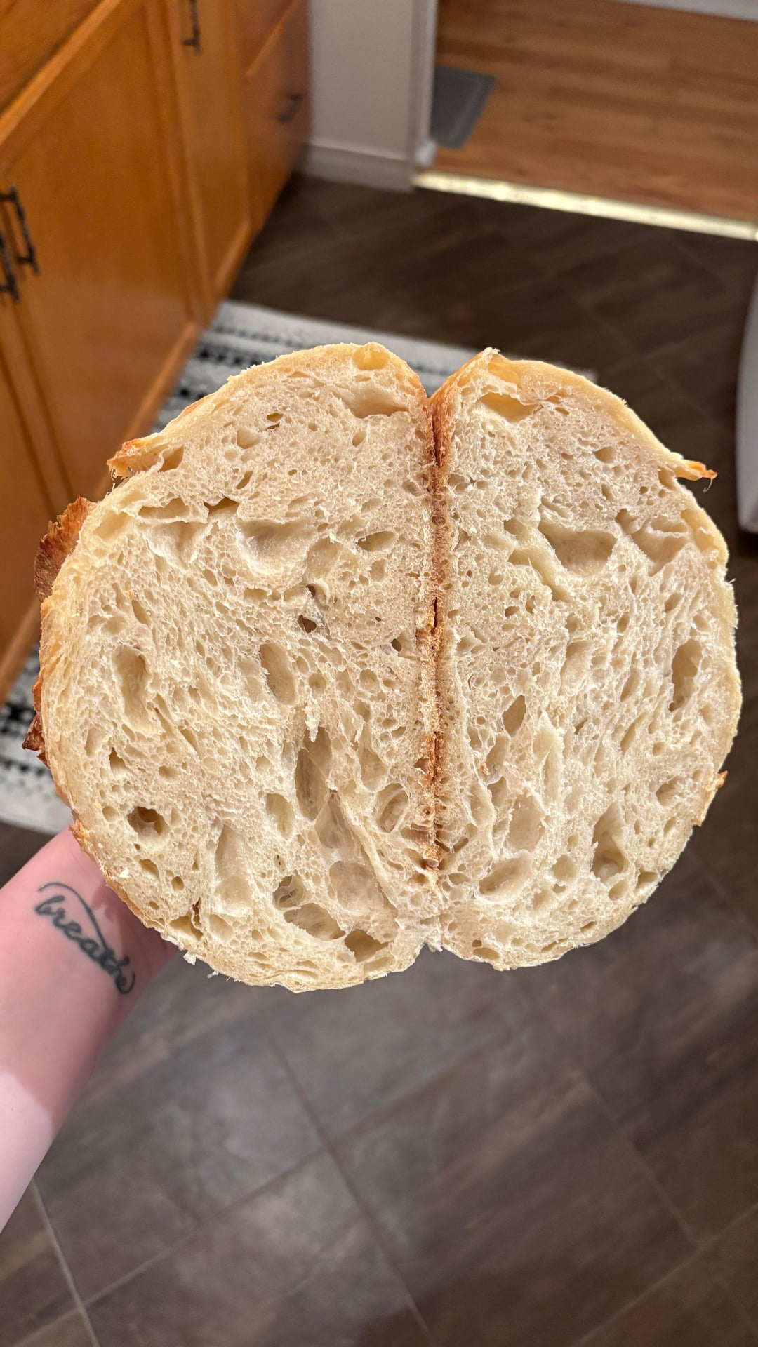 Used https://vt.tiktok.com/ZSDj27856/ for my recipe and technique. 4x stretch and folds every 30 minutes, preshaped, rest for 20 minutes, final shaping, into oven at 450 for 30 minutes then 15 minutes at 400 with the lid off. I bulk fermented in the oven with the light on for a few hours until it was pulling away from the bowl nicely, jiggly, not sticky, and lots of bubbles seen in the glass bowl. I’m thinking slightly underproofed due to a bit of a gummy texture and the air bubbles.