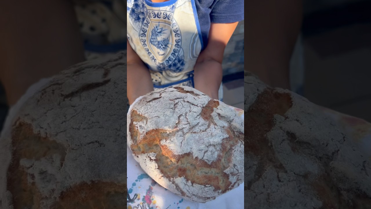 I just made some chiso in the wood oven. Amazing. You hear it? Four cups of white corn flour. Three cups of boiling water. Now you’ve given it a mix. The hot water is cooking and hydrating the corn flour first. Looks like this. Now let it cool. In here I have a little over 3/4 of a cup of water. I’m going to pour half in a bowl. One teaspoon instant yeast. Give it a mix. You want to let it sit for a minute. And the other half of the water, you want to add two teaspoon of sea salt. And you mix that well. Let it dissolve. Corn flour has cooled. In here, I will add four cups of allpurpose flour. The salt mixture. Mix. Now the yeast mixture. Incorporate all of those mixtures together. It’s a drier dough. You feel like you want more water, but that’s what makes the cornbread a dense type of bread. You can see the dough is coming together. That took me less than 5 minutes to knead. It’s in a ball like this. Want to cover and put it in a warm area for about 2 hours until it doubles. The brua or ponyi is ready. You press it and it’s and it stays. That means it’s ready. Add some flour. Add some flour on top. Flour your hands. This will make two. You start flipping it to shape it into the bread. ahead and put it on a cookie sheet. I’m going to use the wood oven today. And it goes in your oven at 425 for about 50 minutes. Here’s the other one. And it goes. There’s the palm. It’s at the 45 minute mark. I’m just going to check on it to show you how to check if it’s ready. Look at the bottom. And you tap it. Feels hollow. It’s ready. Just needs a little bit more. Hello. I’m going to leave it for another 5 minutes. The smells incredible. This is the other one. Feels heavier. Oh, it’s not ready. Going to tap it. Hear it. It’s ready. You have to wait until it cools down or else the pondu will be gummy. Has a beautiful crunch. An oldfashioned Portuguese cornbread. I hope you try the