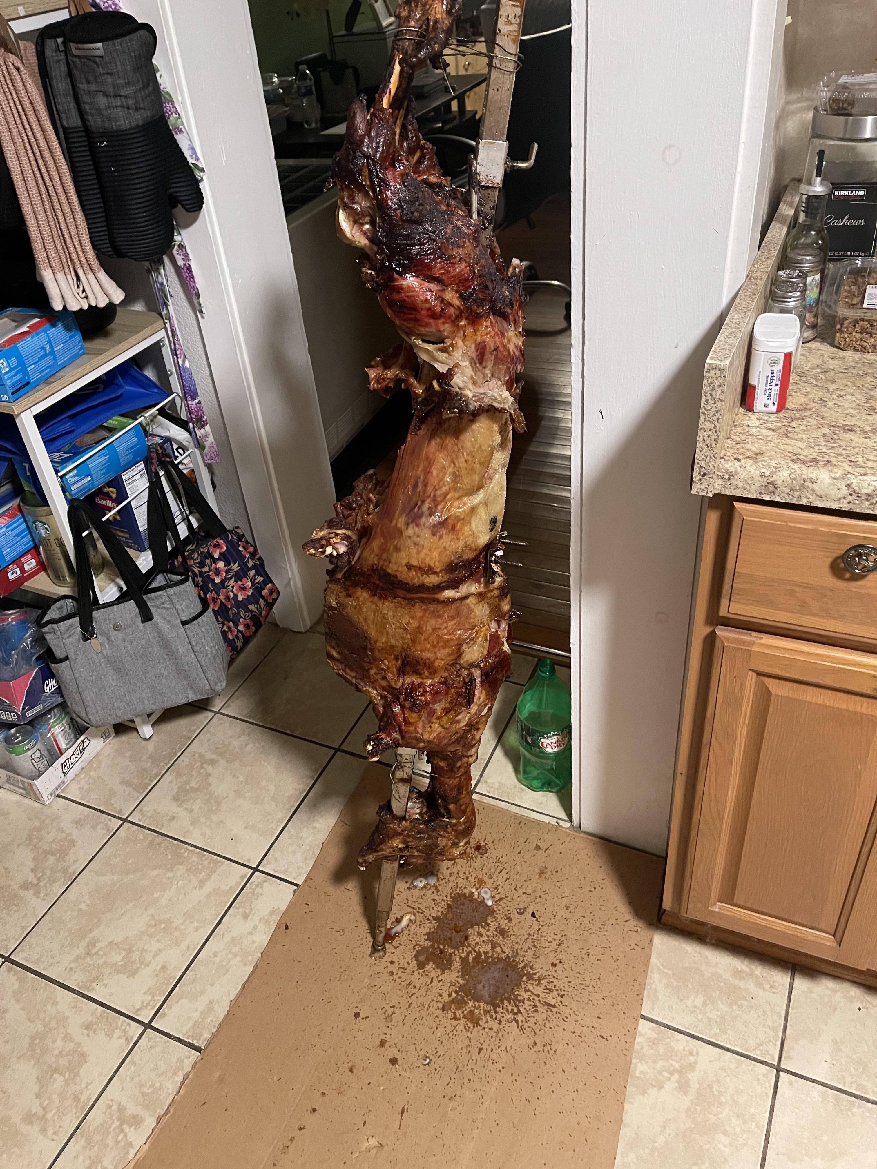 Fuck yea brotha this looks amazing. Lmfao did you kill it out back and butcher it yourself or buy from store. Idk how people get so uncomfortable from stuff like this. His kitchen is not dirty, why would they have to set it up horizontally on a table? I’d be collecting the drippings with a pan personally lol