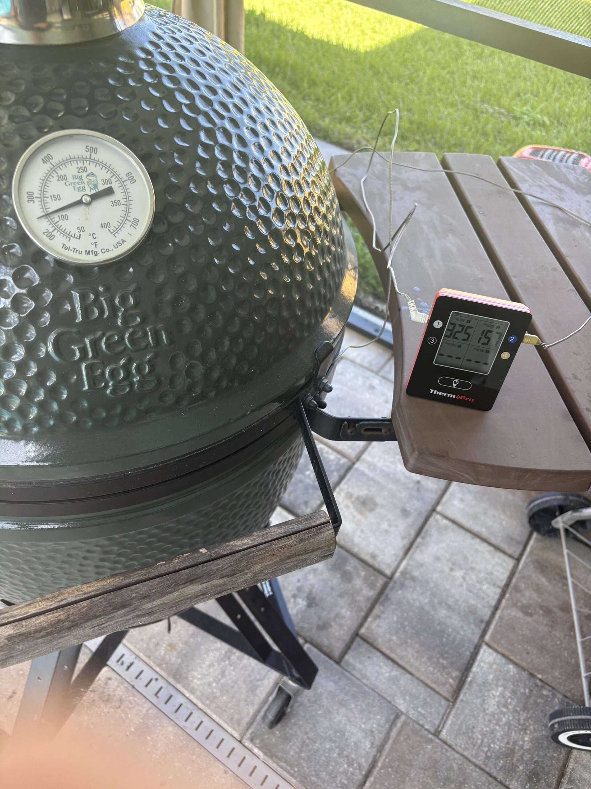 First time cooking on my new to me BGE and have a question about the temp. As shown in the photo the thermostat built in the lid shows a temp of 250 but my probe that’s sitting on the grate show a temp of 325. I’m assuming to go by the BGE thermostat.