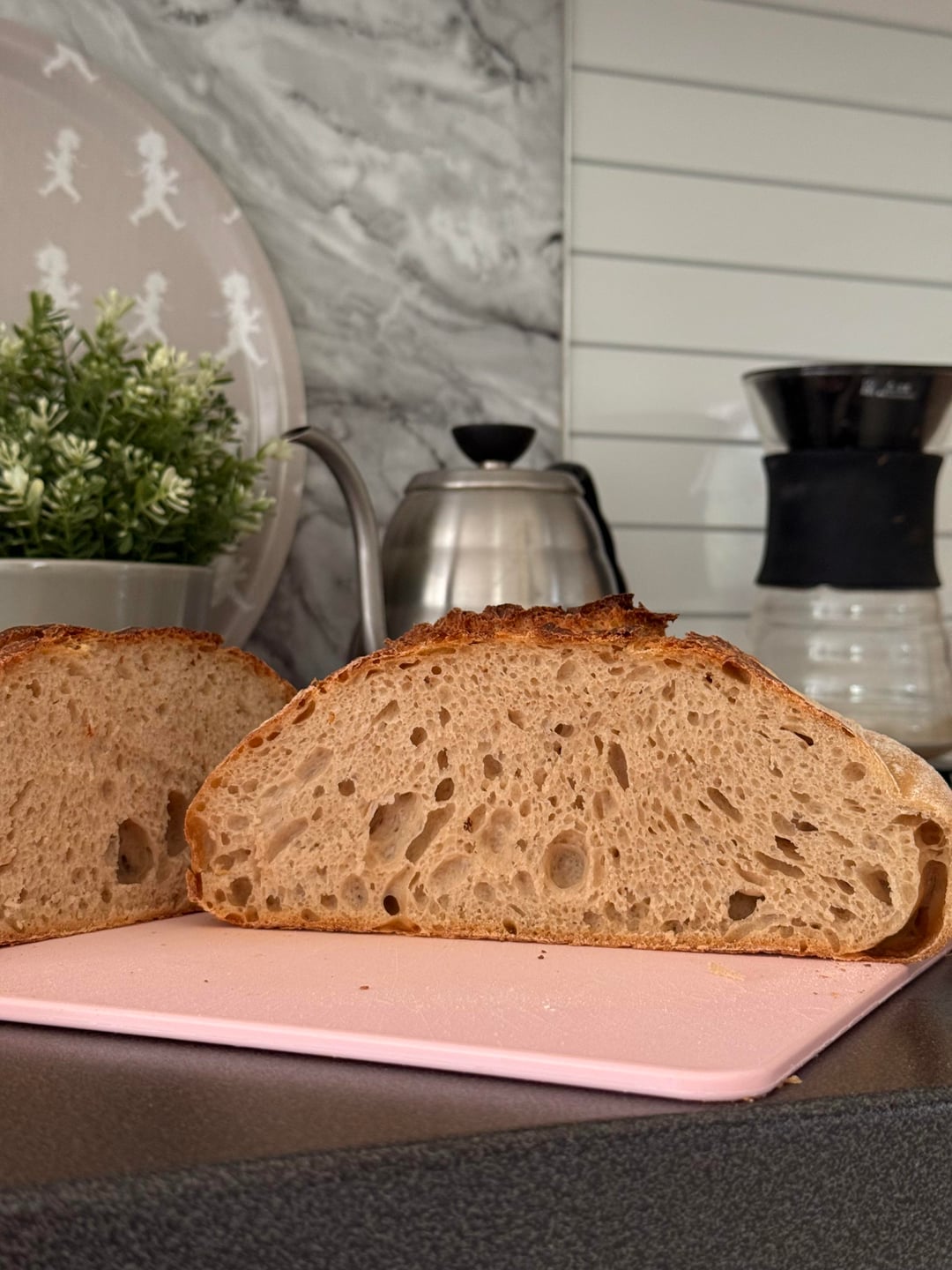 Recipe: 600g wheat flour, 150g spelt flour, 500g water, 225g levain, 20g salt.