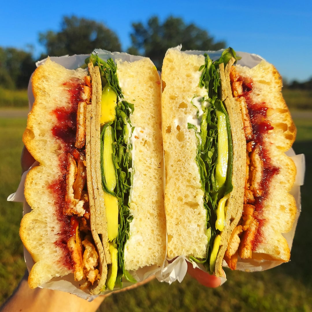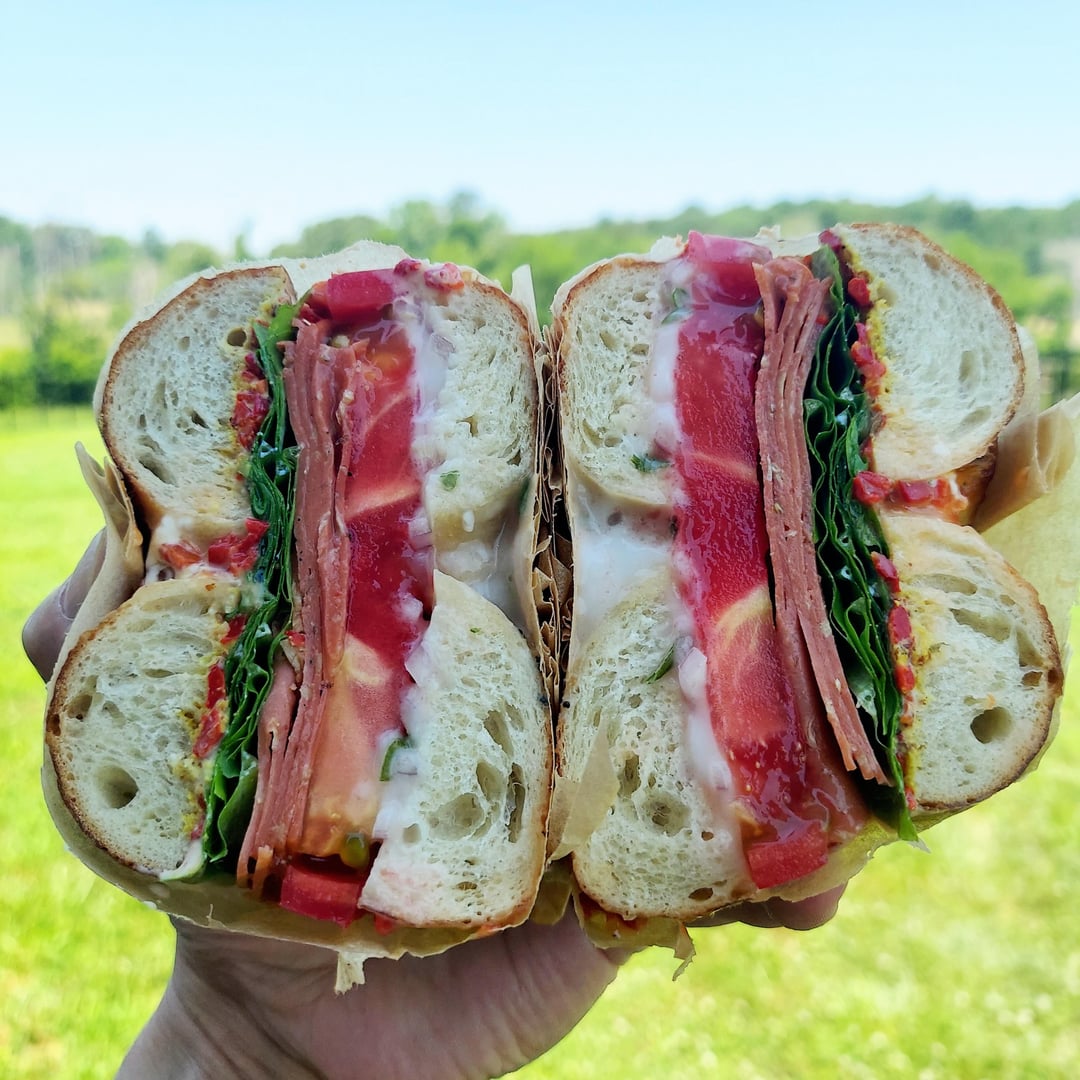 20) Yves ham & salami, scallion vegan cream cheese, heirloom tomato, and Wickles snatched does on a sea salt bagel