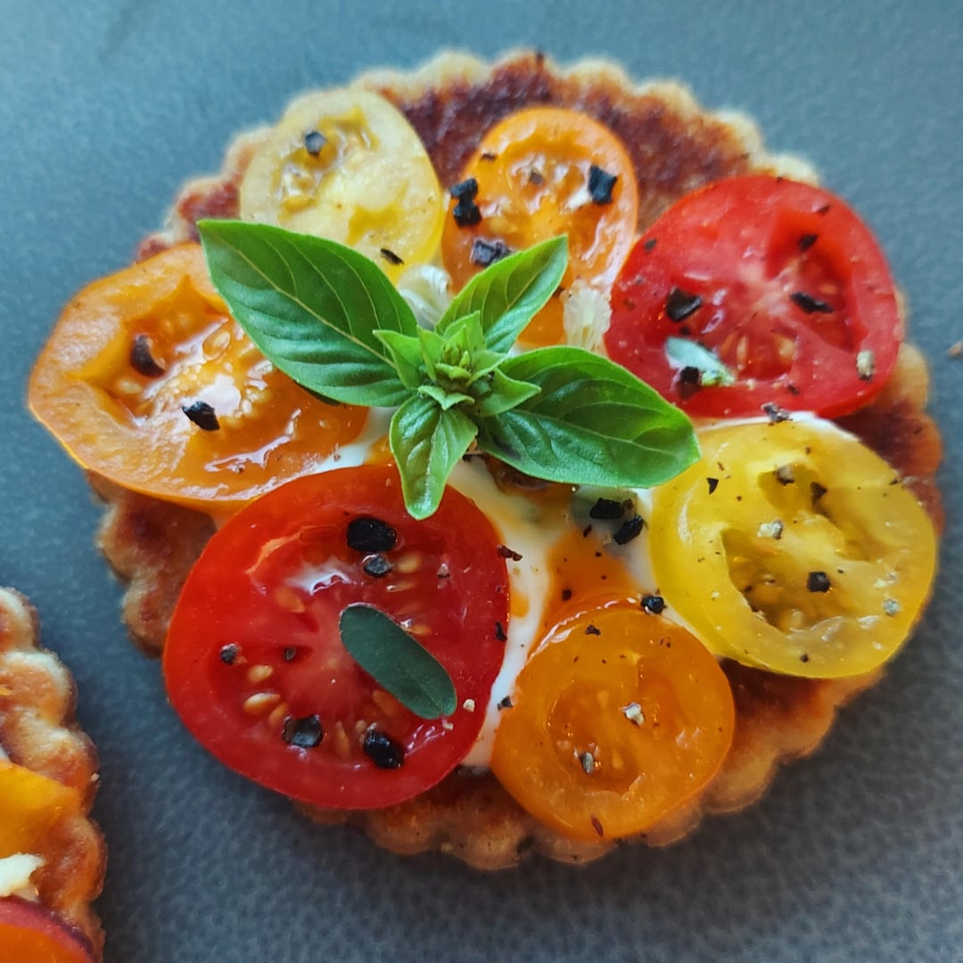 9-10) Open-faced sandwiches (made from rolled-out white bread fried in vegan butter) with cherry tomatoes, basil and garlic aioli and peaches and vanilla yogurt with crumbled marcona almonds;