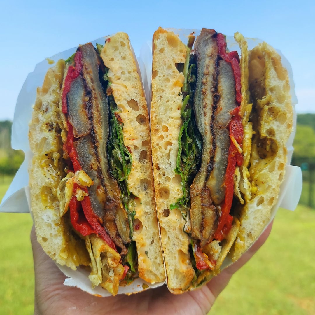 12-13) Roasted harissa baby eggplant, piquillo peppers, jalapeno potato chips, pistachio butter, and a chili-orange aioli on a homemade Italian sesame loaf;