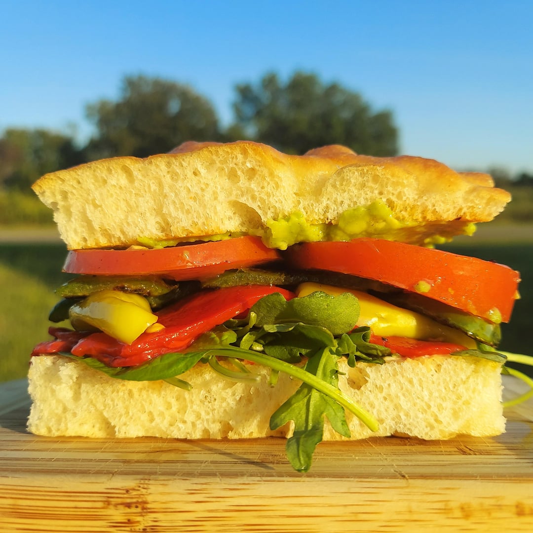 2-3) Mashed avocados, piquillo peppers, blistered jalapenos, peperoncini and tomatoes on focaccia;