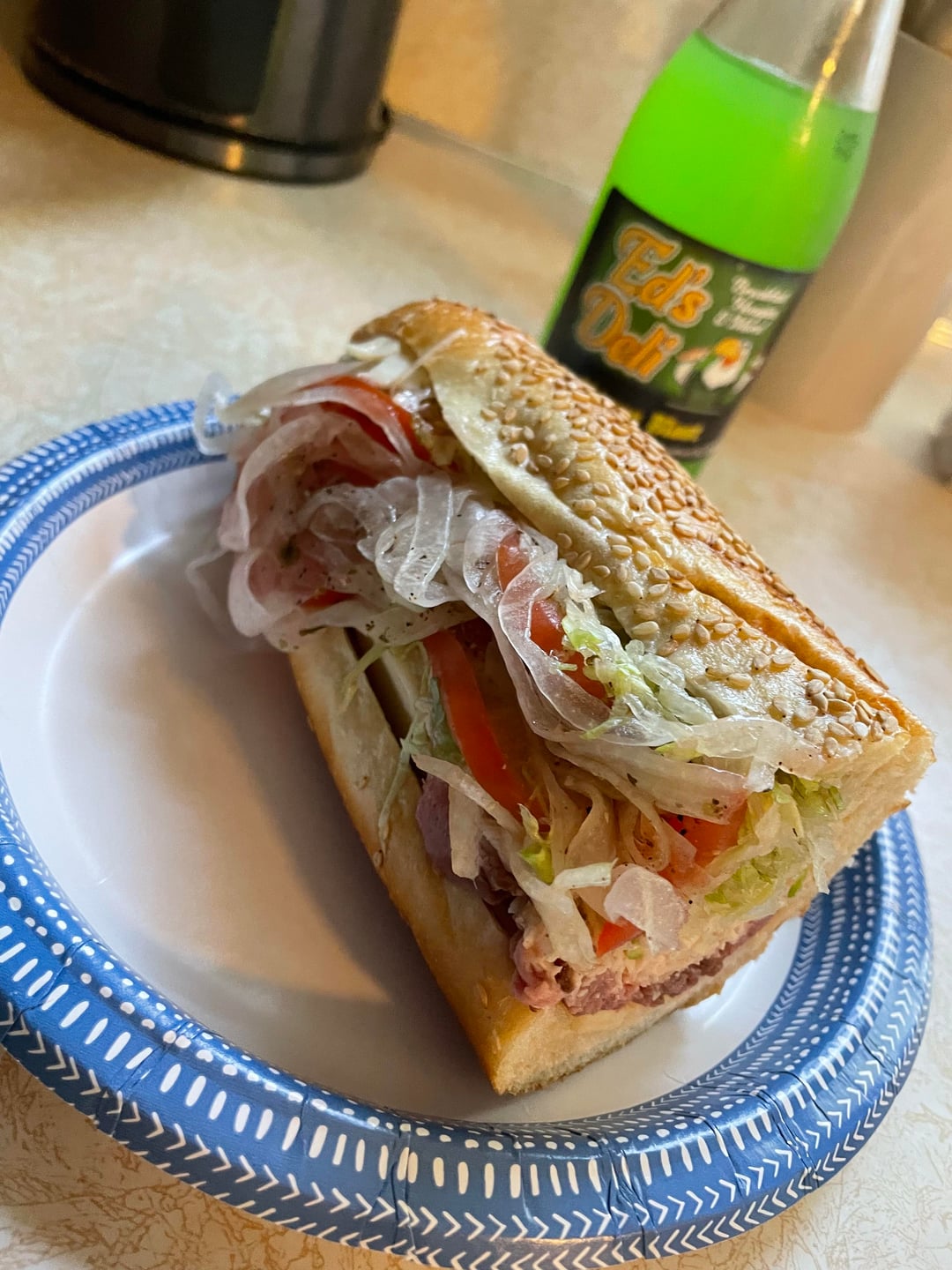 Called the “Mrs. Stephanie” consists of turkey, roasting beef, sharp provolone, lettuce, tomato, onions, oil and vinegar on a seeded roll. Go Birds!!!!🦅