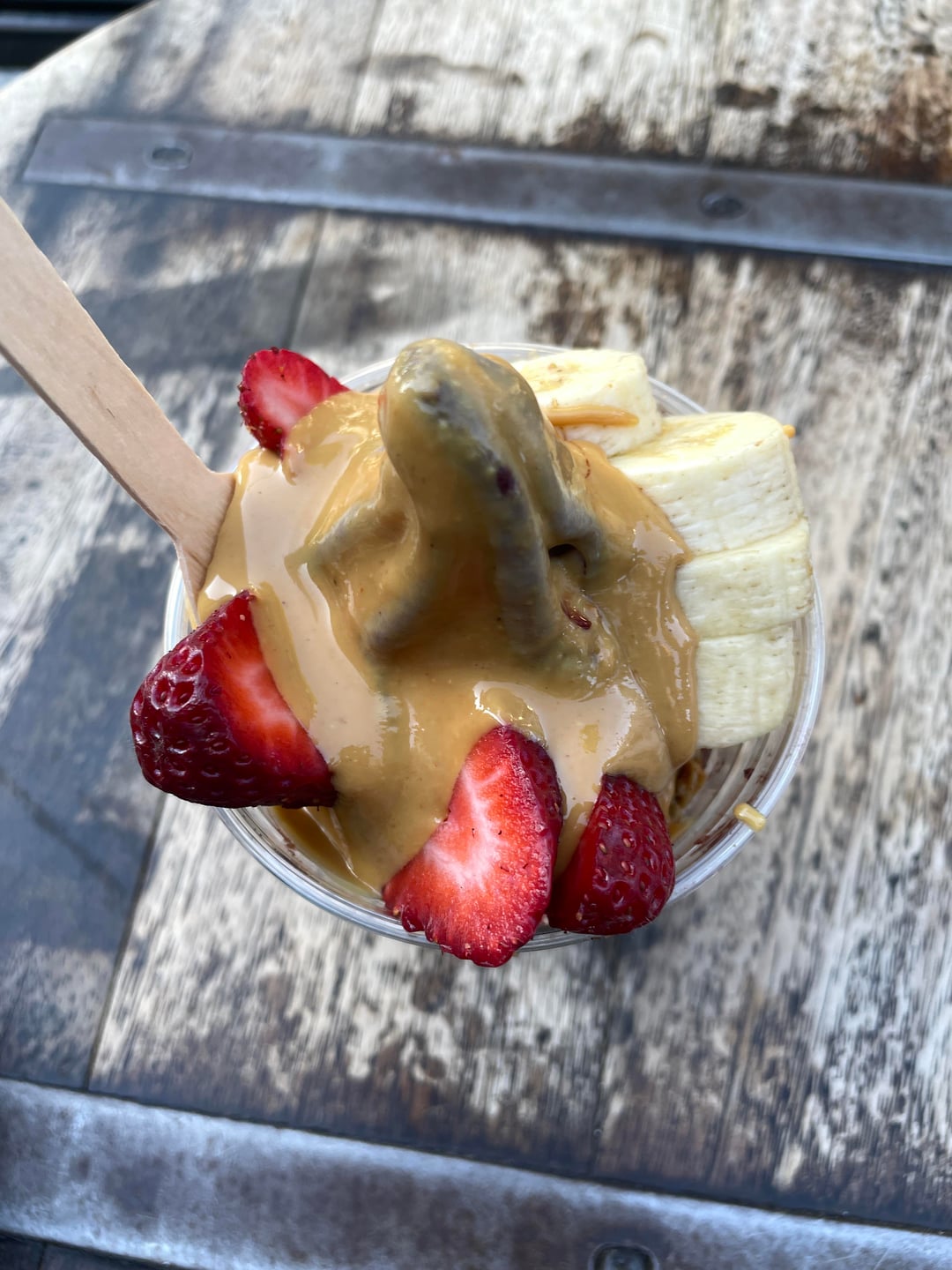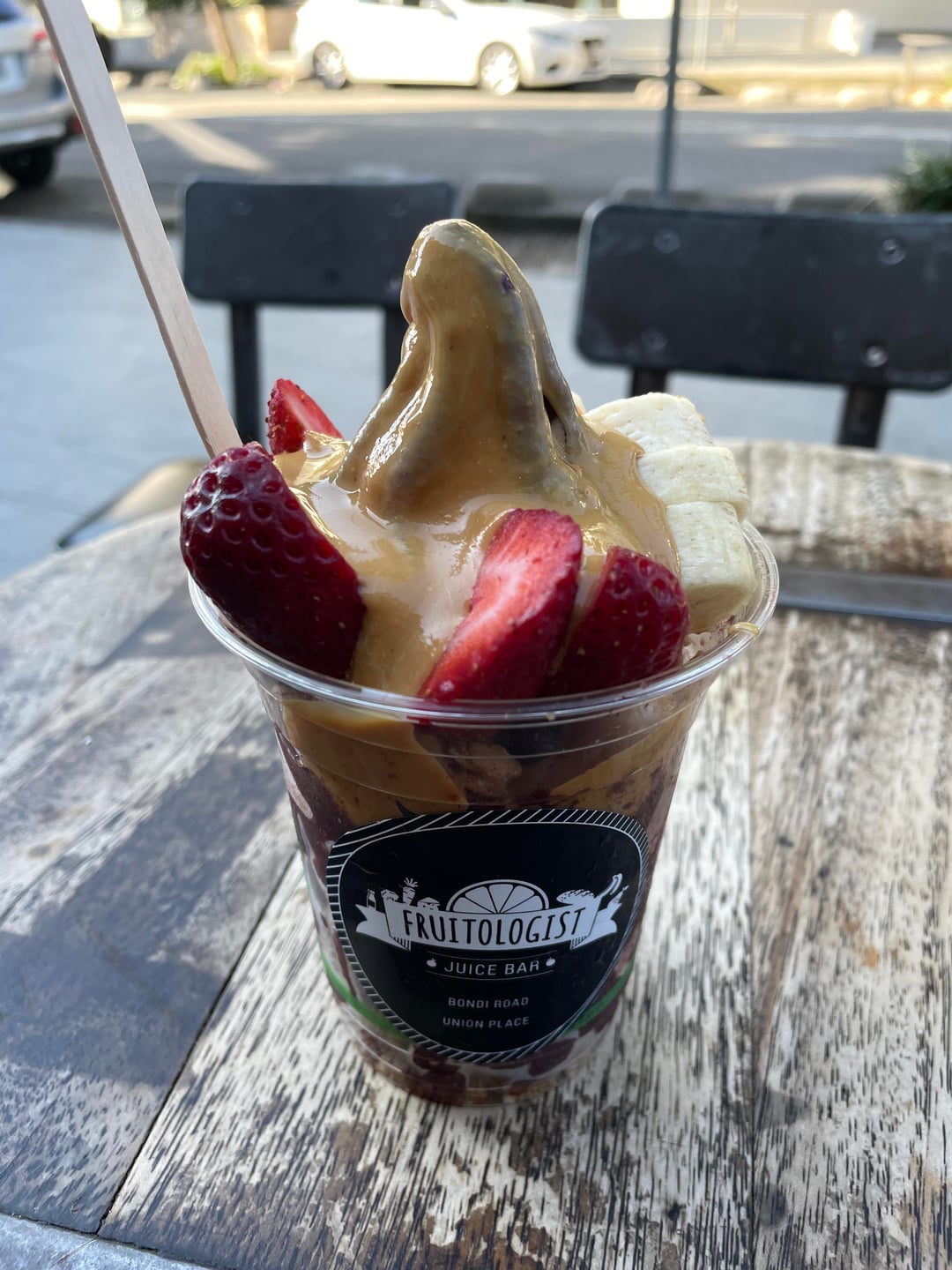 I weighed the cup as 211g without the actual cup and spoon. Strawberries: 75g PB: not sure – a generous tablespoon? Granola: shop said they put half a cup Banana: maybe 30-40g?by ThenStable Dining and Cooking