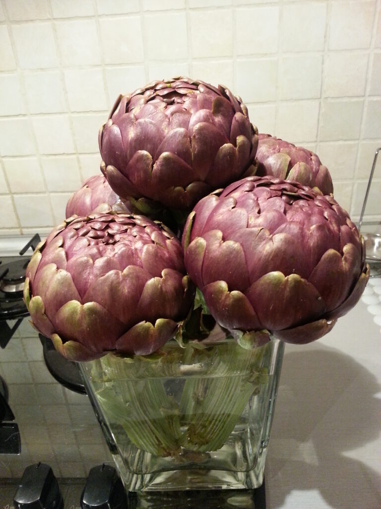 Come late winter, markets fill with these beauties, and I buy them in odd numbers, as with flowers, and keep them standing in a vase with water until I’m ready to clean them—no vegetable is lovelier to behold. Artichokes darken easily, and darken your fingers too, so I wear gloves to peel away the tough leaves, trimming them down, then soaking them in water with lemon juice. Under cold running water, I gently pry open each heart, fill each one with minced mint, garlic, salt, and pepper. Then I set them head down in hot oil, splash them with good white wine, flip them upright on their stems, half-cover them with broth, and let them barely simmer for half an hour, under a lid sealed with a sheet of parchment. If the artichoke is fresh, it turns out tender—not fibrous—savory and delicately tangy from the lemon and wine.