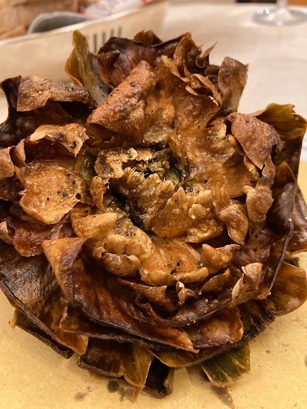 First, the artichoke—specifically the round, tender cimarolo or mammola varieties. In Rome, you eat them fried alla giudia or braised alla romana. The first, the Jewish-style artichoke, is not an everyday affair—it takes a sure hand at frying in the right earthenware pan, and a host of little tricks. I once ate it in a trattoria in the Roman ghetto, served open like a peony, laid on a folded napkin to catch the excess oil.