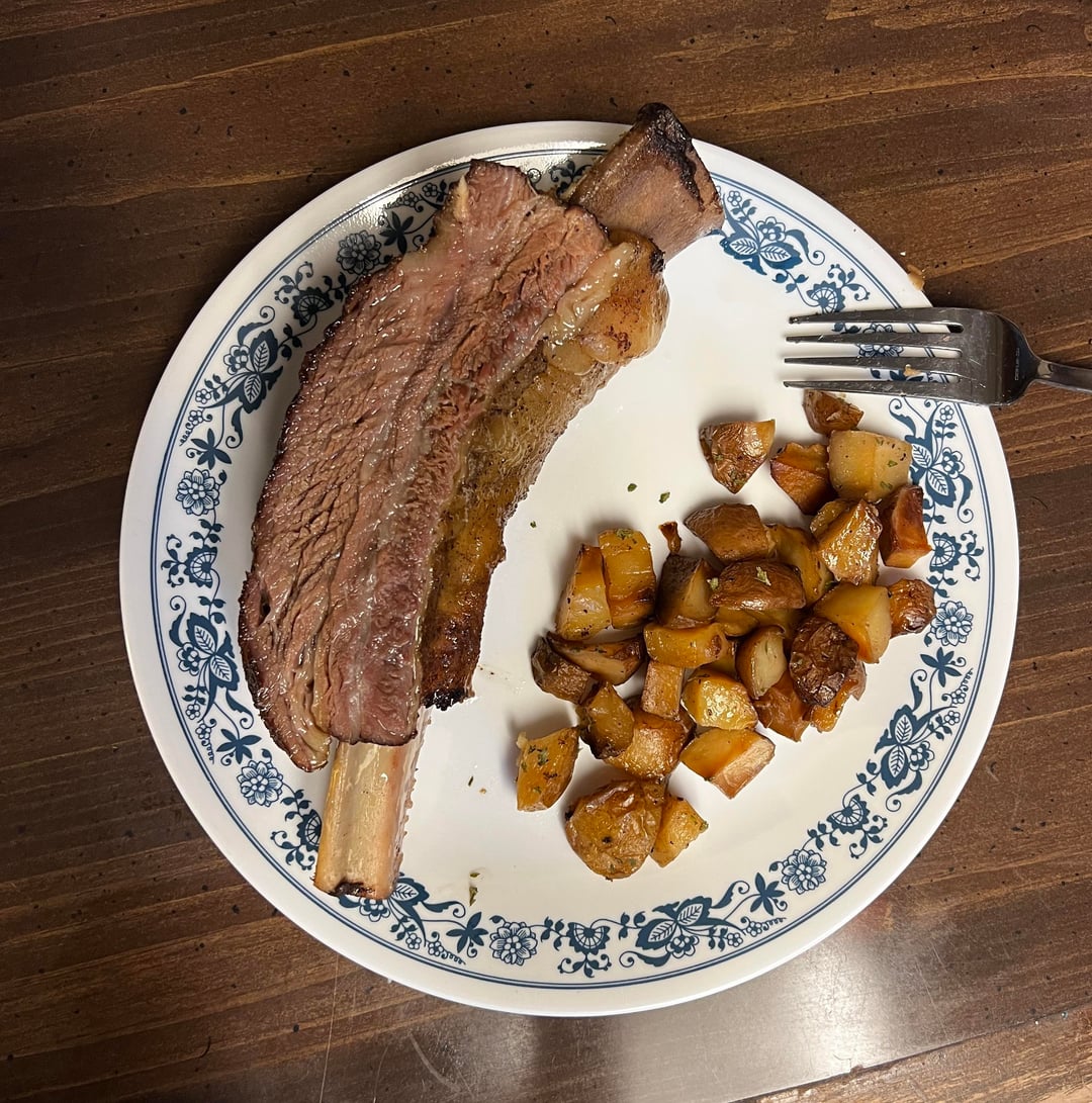 Smoked a short rib plate with apple and cherry wood for a few hours at 250, then wrapped it until internal temp 205’. Let it sit in a cooler for 1.5 hrs. Also had a side of potatoes. Tasted fantastic, will definitely be doing this again!