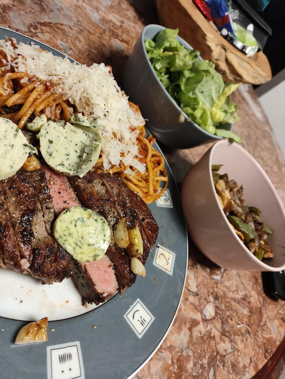 I did a Roastbeef Steak. 3 hours at 53°c. As side dishes i did Pasta pomodori with Basil, roasted veggies and a simple salad with oil and vinegar.