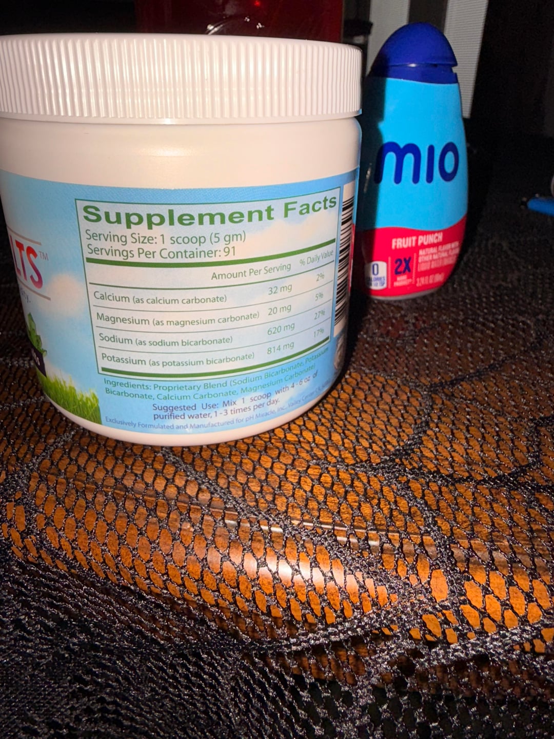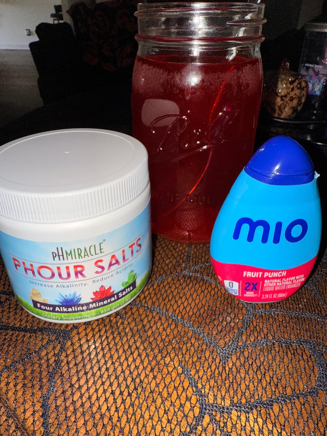 I used: Large Mason Jar of Water 3 scoops PHour Salts (comes with scooper) 2-3 squirts of Mio Fruit Punch