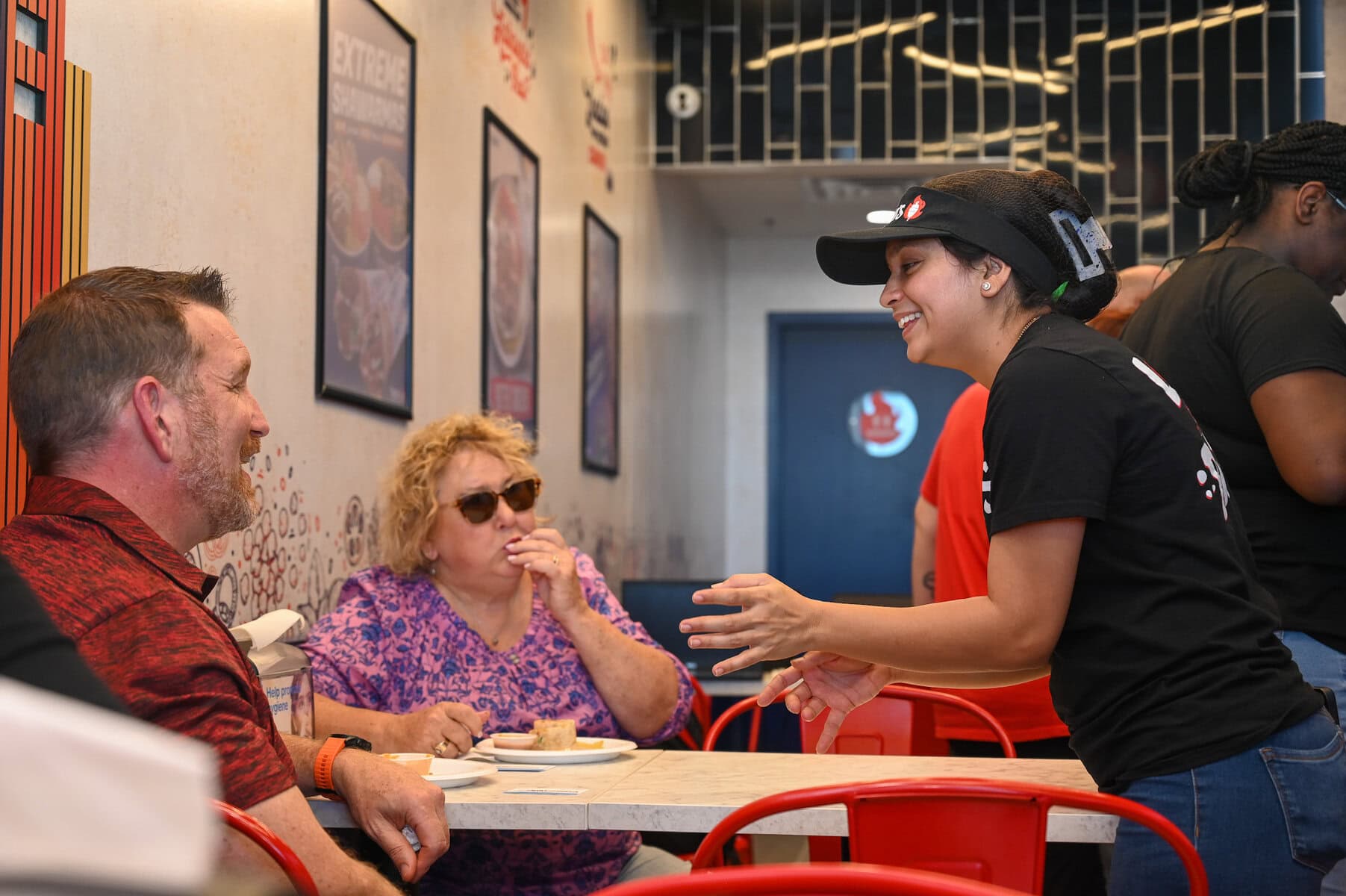 Franchisee Vaishu Patel talks with Markus Smith on Monday, Sept. 15, 2025, during the grand opening of Tahini’s in Loves Park. (Photo by Kevin Haas/Rock River Current)