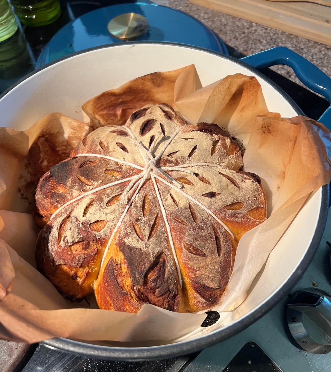 - Score loaf and put in DO with the lid on for 35 (maybe 40-45 for this one) minutes. Drop the temp to 450°F and bake for 10 more minutes with lid off.