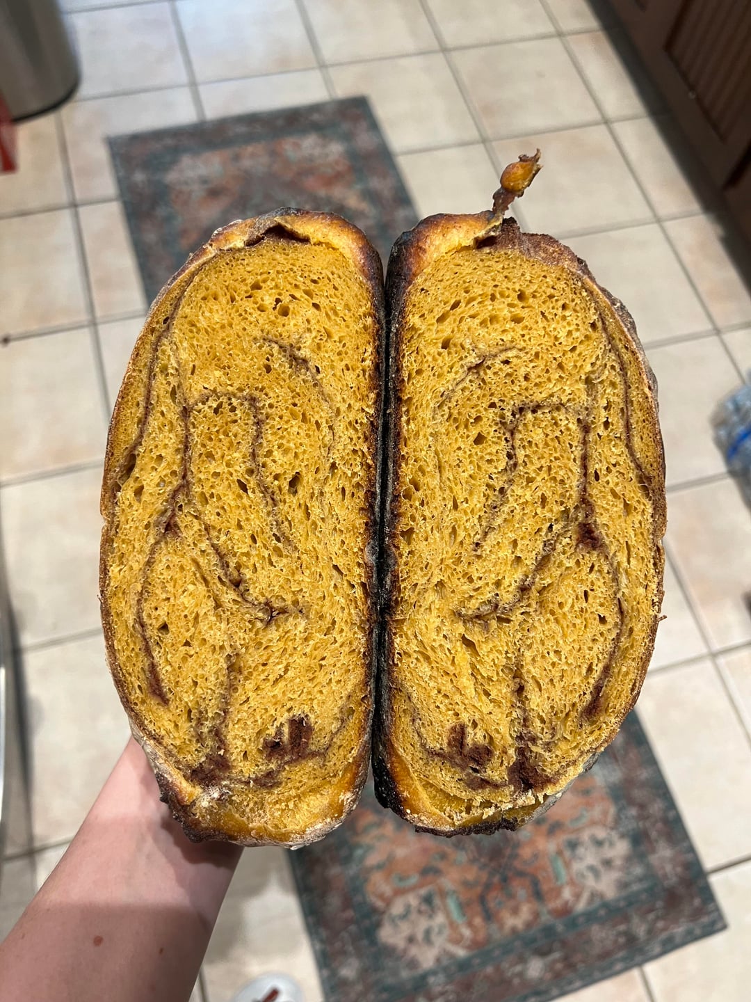 This is my fifth loaf using my starter and although I think it could have done with a couple more minutes in the oven (and probably also a while cooling still, you can roast me for that but I had to cut it open lol) it turned out really tasty! I’m really proud of this one, I was a little nervous because the pumpkin added extra hydration but it all worked out in the end.