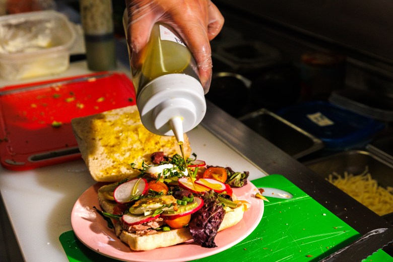 The seafood-and-vegetable-stuffed pan bagnat ($13.50) might not be the first sandwich that comes to mind when a Californian thinks of French food, but it’s a classic. This hefty lunch is, essentially, a Niçoise salad on bread. If you haven’t experienced the coastal marriage of tuna and anchovies with briny olives, hard-boiled eggs, crunchy radishes and fresh tomatoes held together by a crusty loaf, I encourage you to give it a go.