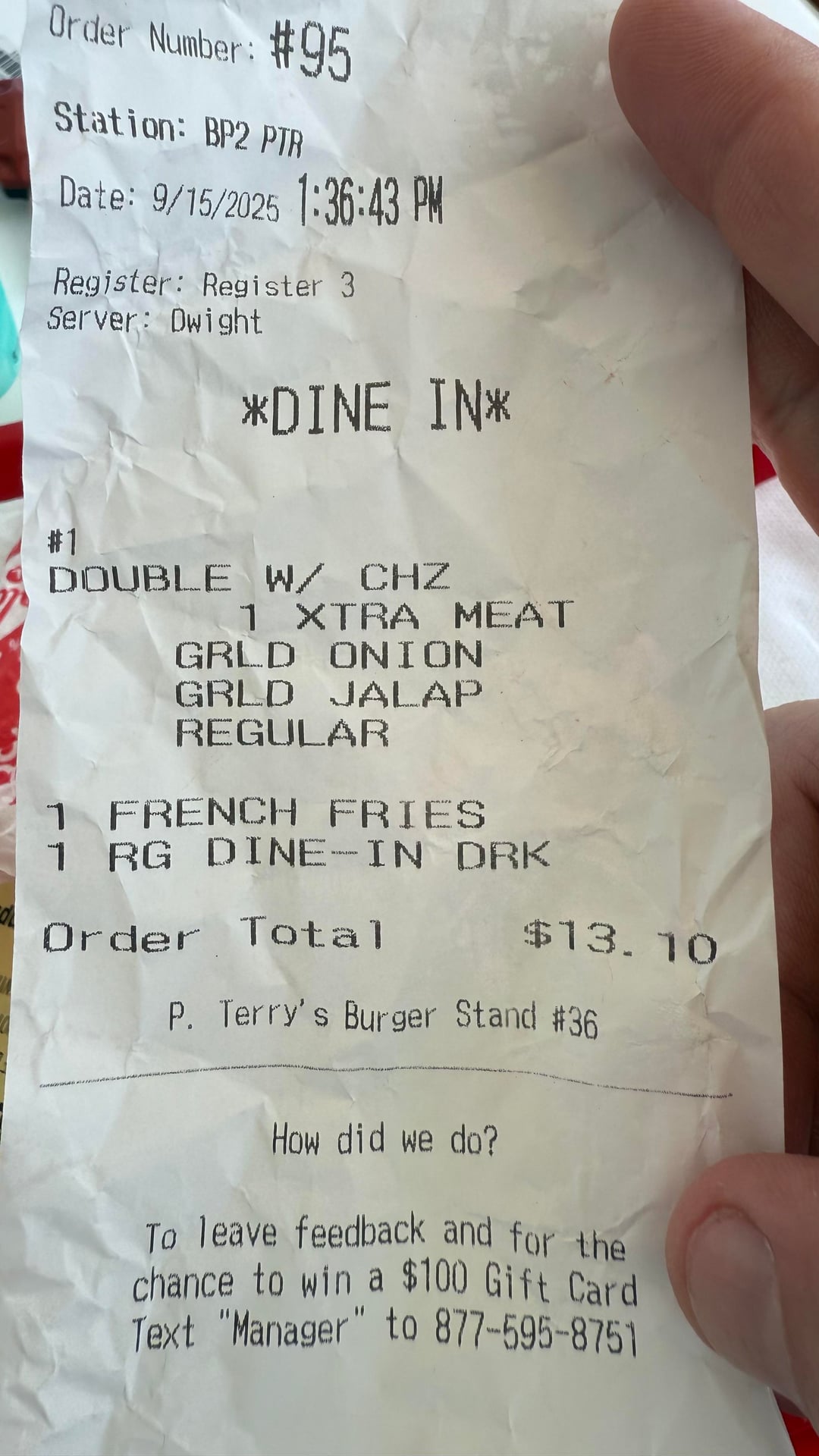 Pretty good burger for the price. Had better, had worse. Burger is pretty heavy on the black pepper, which I don’t mind, just something I noticed. Fries were a bit soggy but I think that’s cause I left them wrapped up in the little paper bag longer than I should have and they sat there steaming. I also enjoy calling it P’Terry’s instead of P. Terry’s.