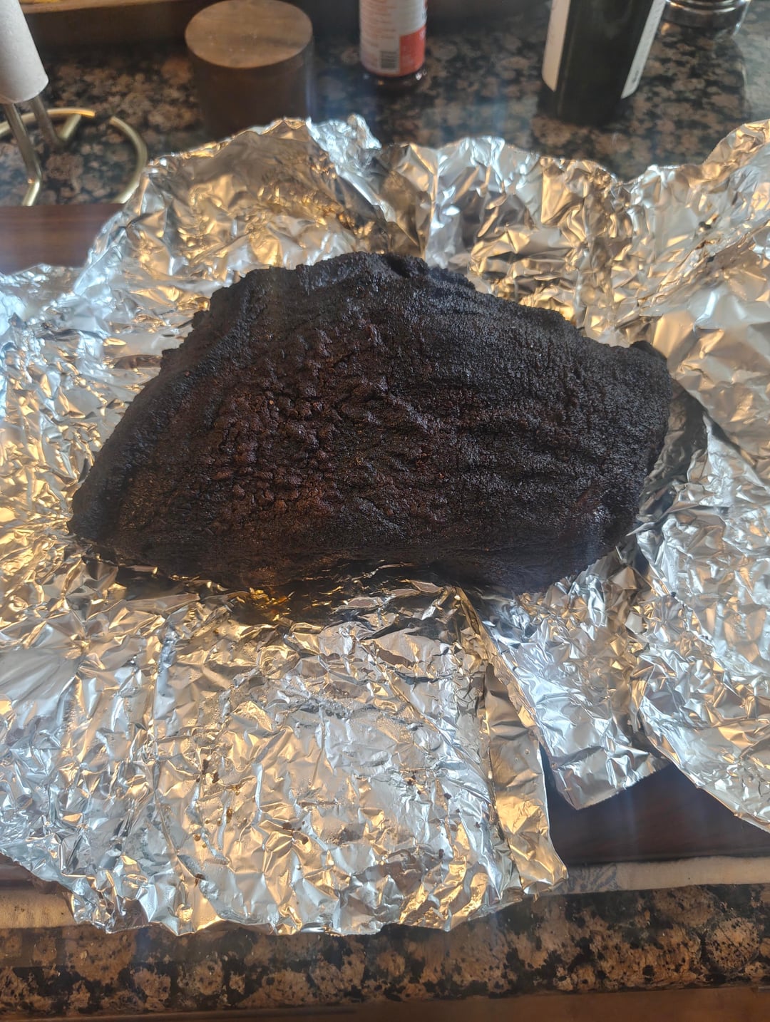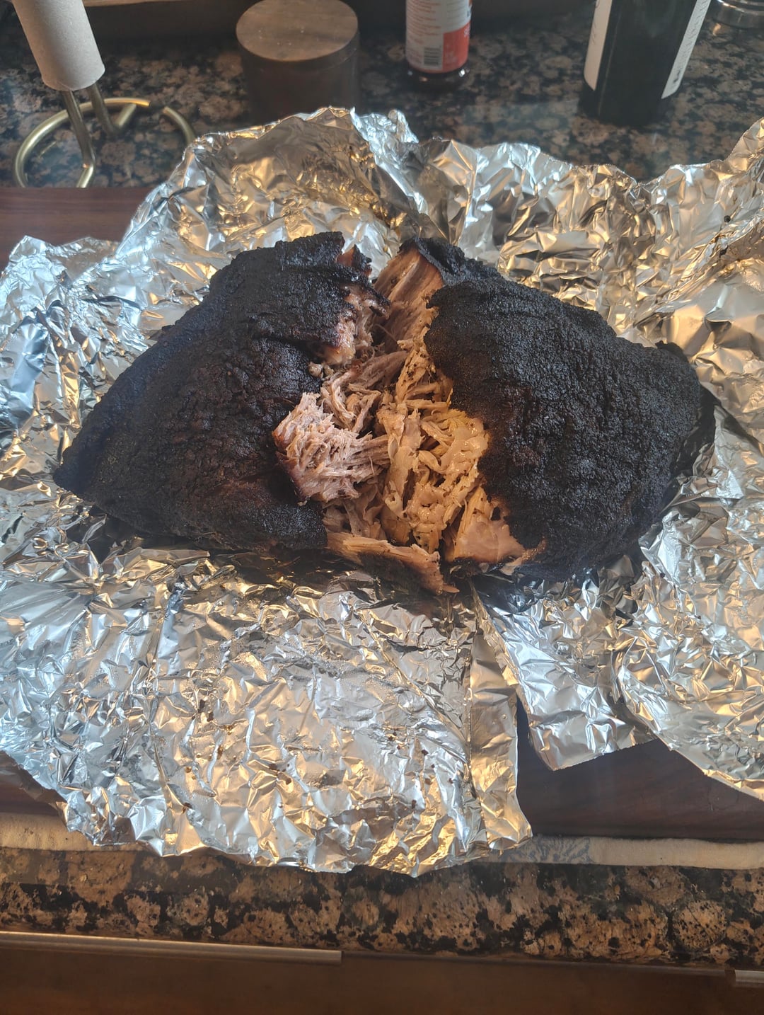 Threw the meat on the grill at 1:40pm or so with an internal probe inserted. At around 5:30 it's stalled at 150° for about two hours, and then began to climb again, though more slowly after the stall. Stalled again at around 4:00am this morning at 190°. When I woke up I cranked the temp up to 275°, and it started to climb again. Pulled it 205° this morning at 6:20. I wrapped it in foil and let it rest in a Styrofoam cooler for a couple hours. It had cooled to 160° when I started pulling it apart. Olim looking forward to some sandwiches and sharing with friends.
