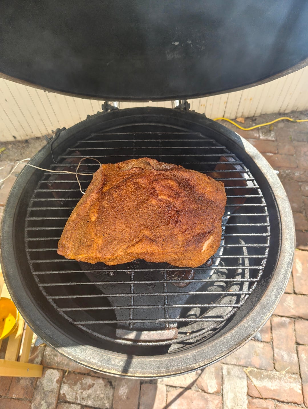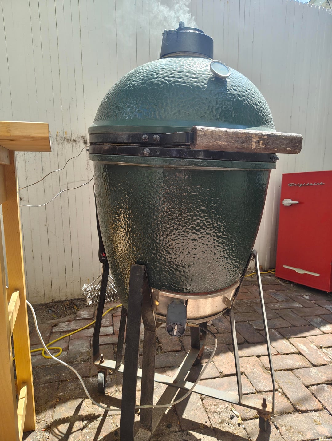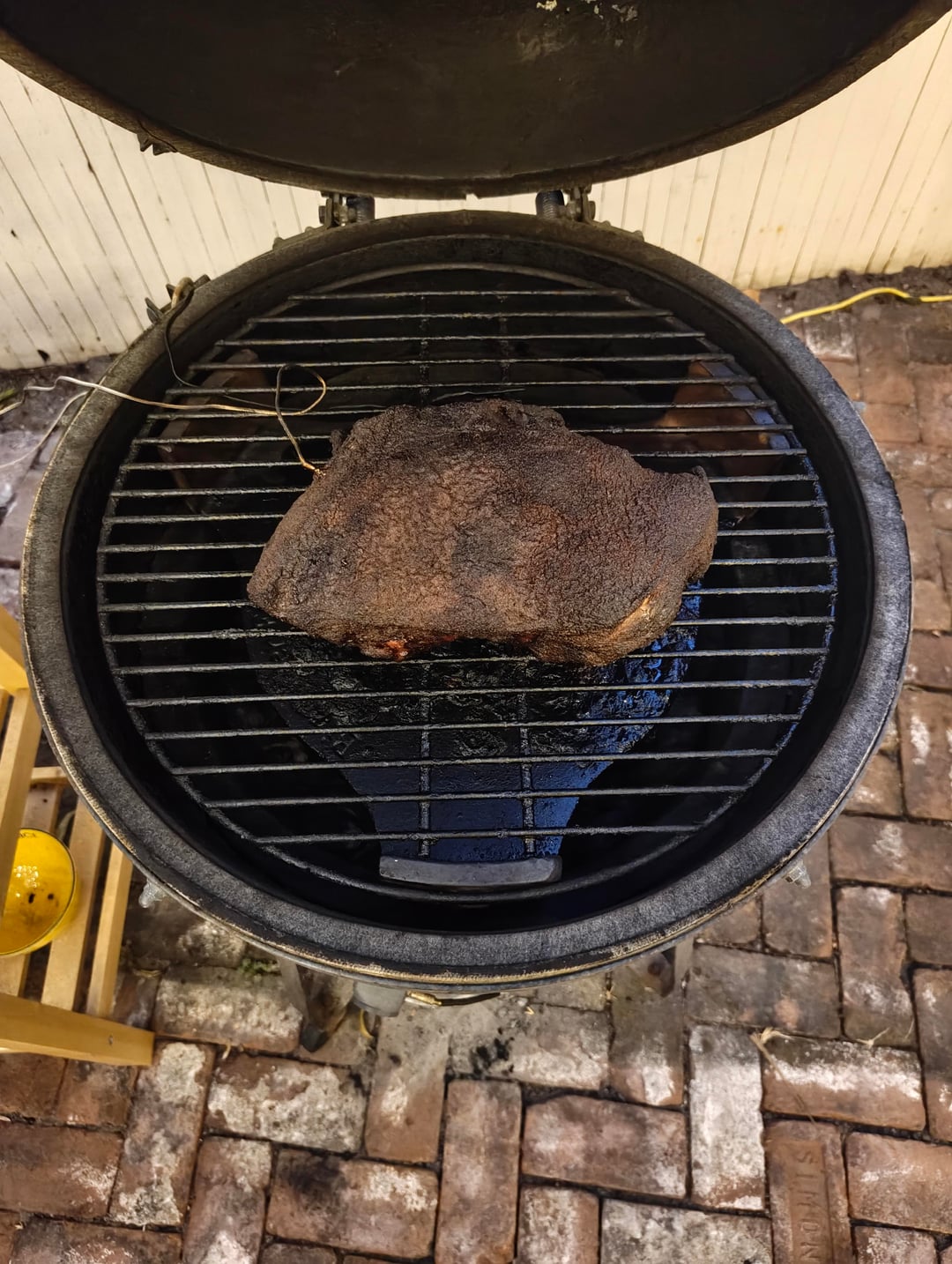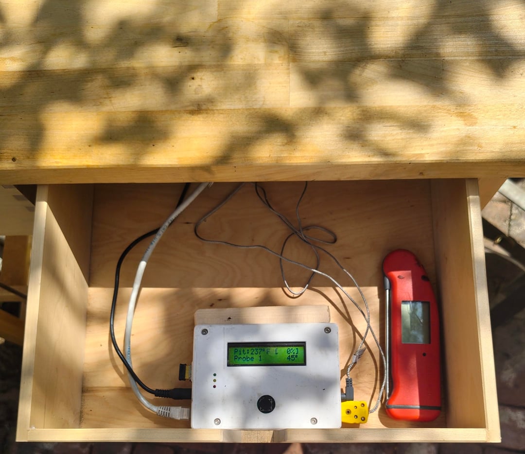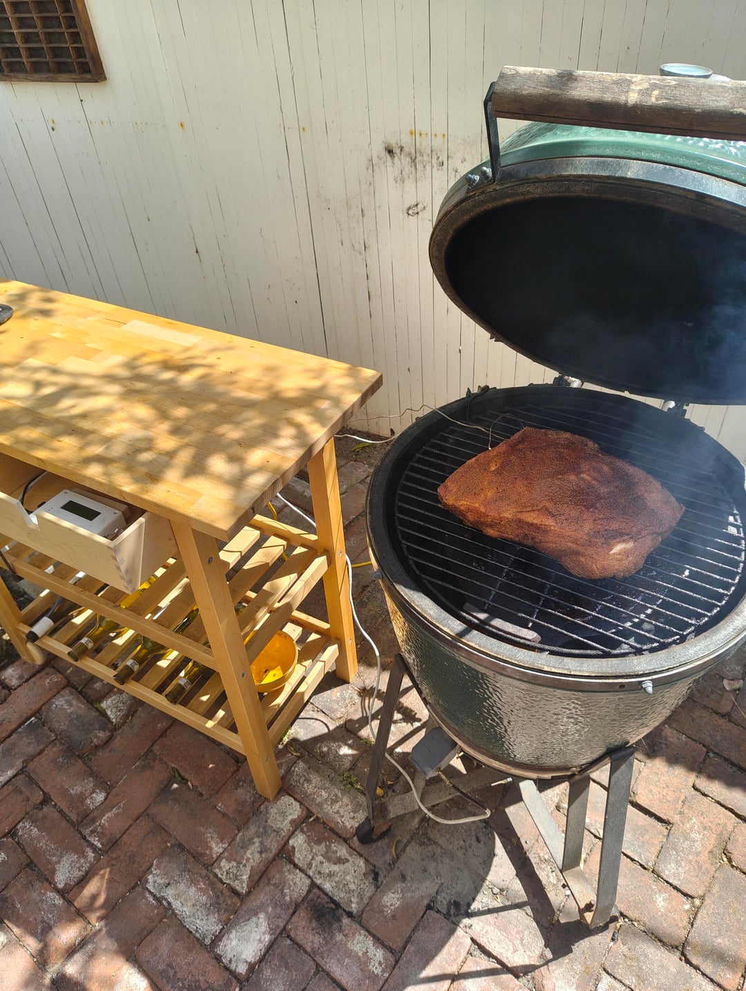 I started with a thin layer of charcoal and got them started. I had the heatermeter set to 225°, fan was blowing 100%. Once hot, I added more charcoal, layering in a handful of wood chips. I'd only ever done long smokes with lump and didn't want to run out of fuel, so I filled the box.(Turns out I didn't need that much) Placed the ConvEGGtor, placed the grate, and clipped on the grate thermometer.