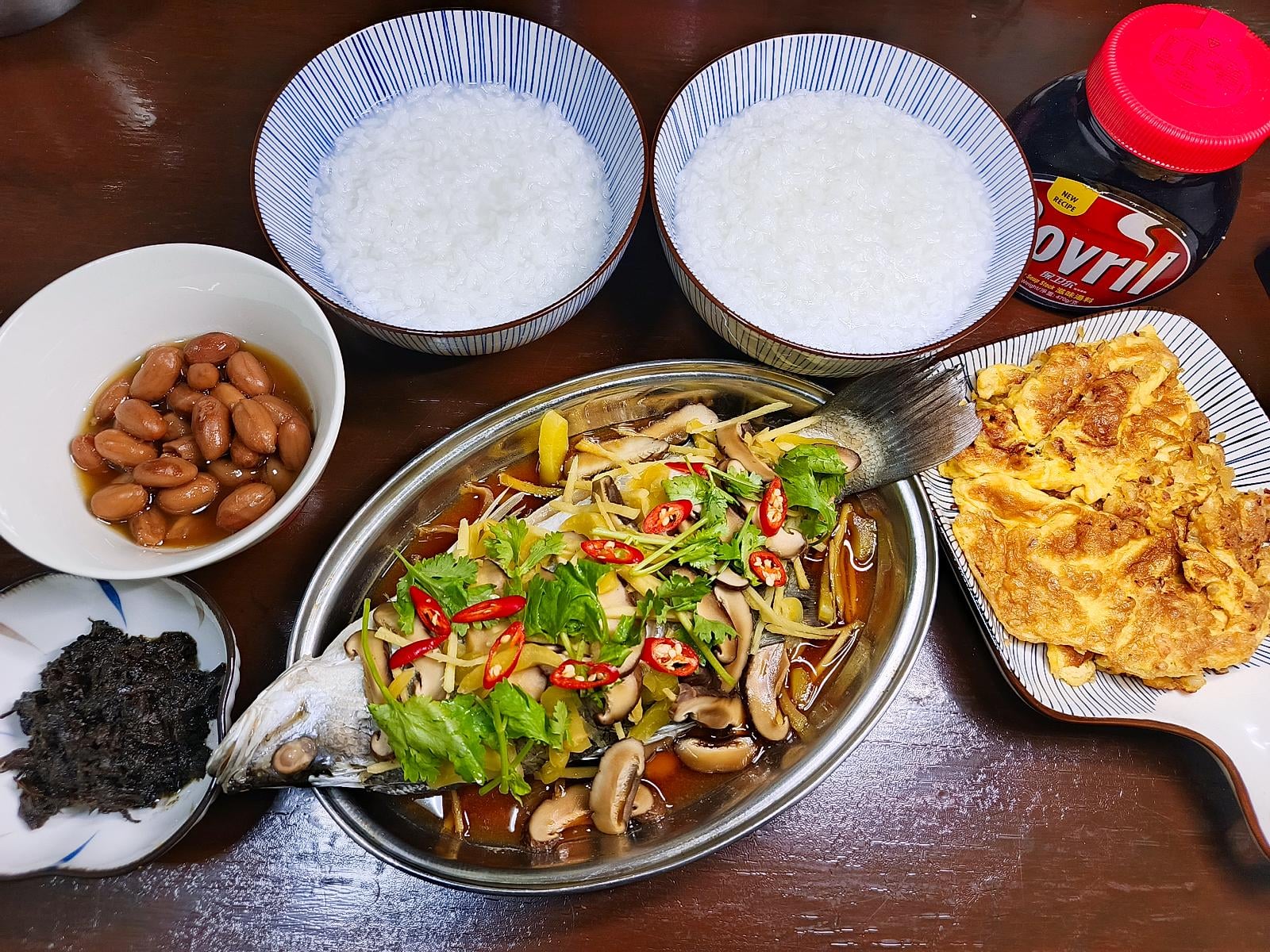 Teochew porridge with steamed barramundi and chai po (preserved radish) omelette 💗 my kinda comfort food 🤤 by Big_Biscotti6281 Dining and Cooking