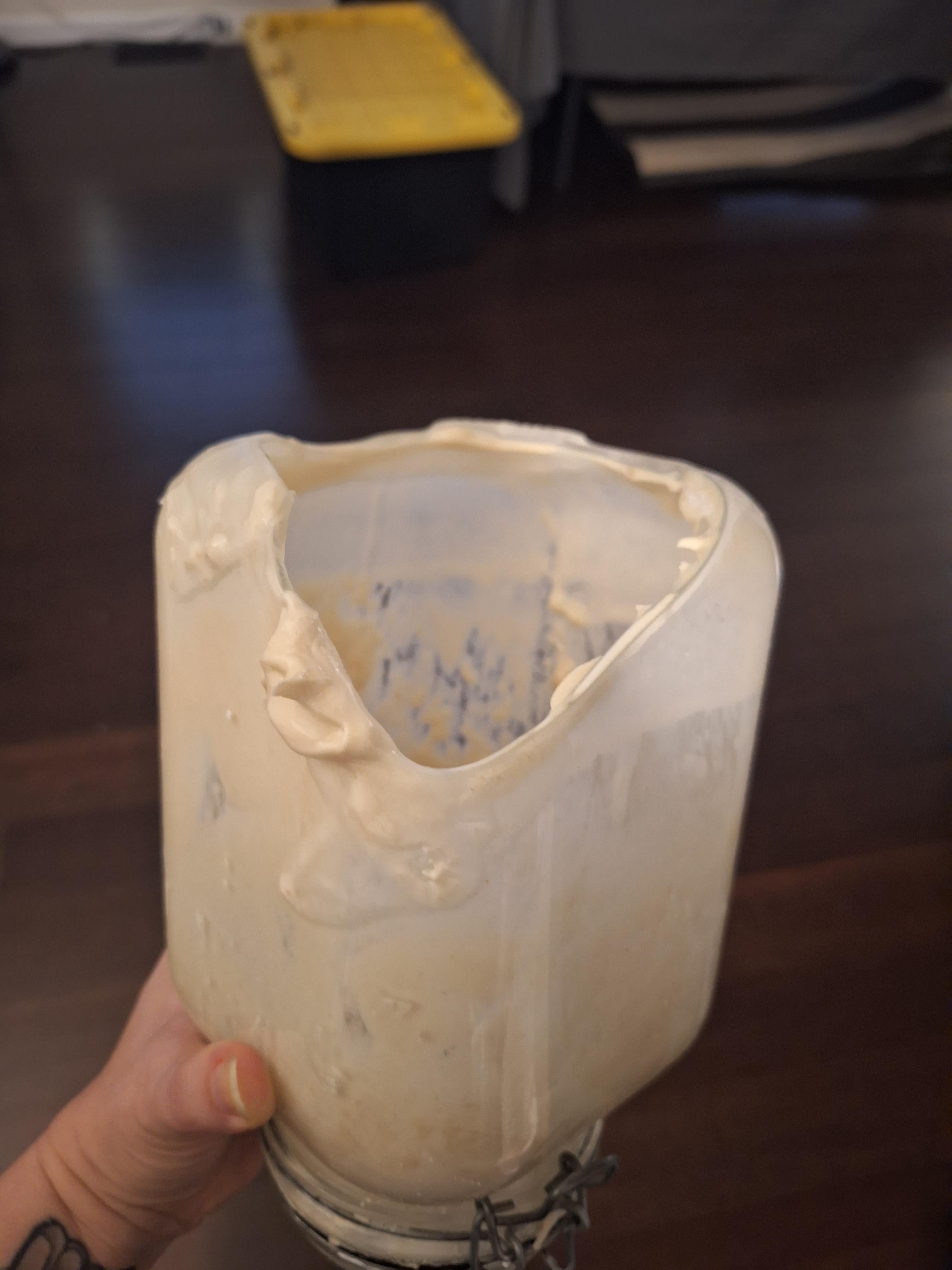 I had already long transitioned to plastic cambros when I started my business in 2022. This was just my OG starter and I kept the jar around for nostalgia and my personal baking. I had some excess in there from my own stash, so my husband poured a lot of it off into a cambro before feeding anyway. We only lost 3, maybe 4, loaves worth of starter, and the jar itself.