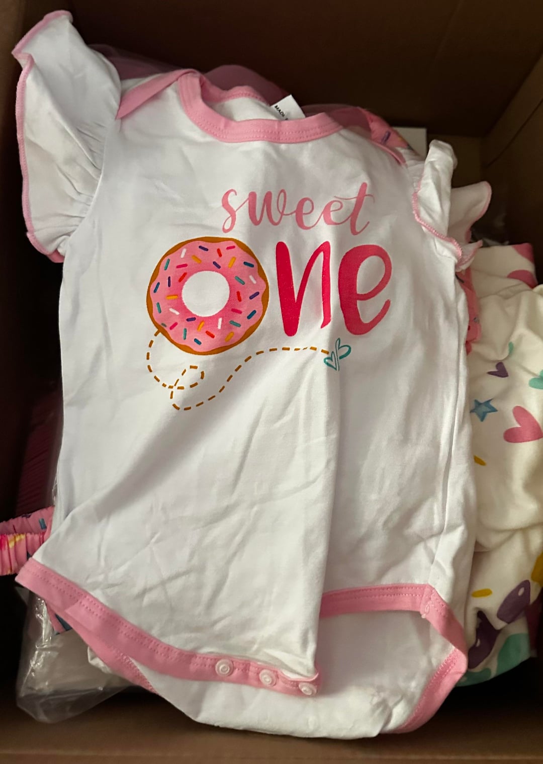 Birthday girl’s onesie (third pic) was the inspiration. This was my first time frosting a cake with an odd shape, and I learned a lot! Funfetti cake with buttercream and royal icing.
