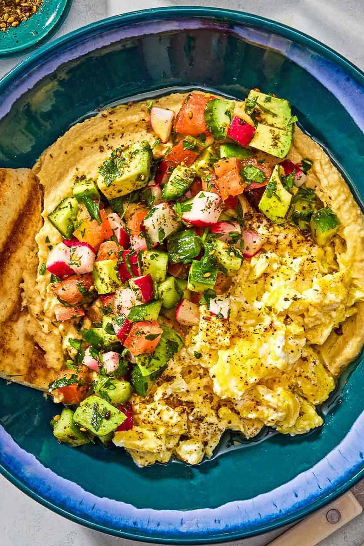 If you’re looking for a high fiber, high protein meal, this powerhouse of a breakfast bowl is your ticket. And feel free to swap out the hummus with other spreads to keep things interesting–Muhammara and Spinach Vegetable Dip both come to mind.