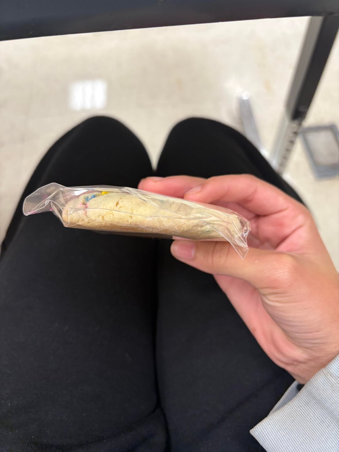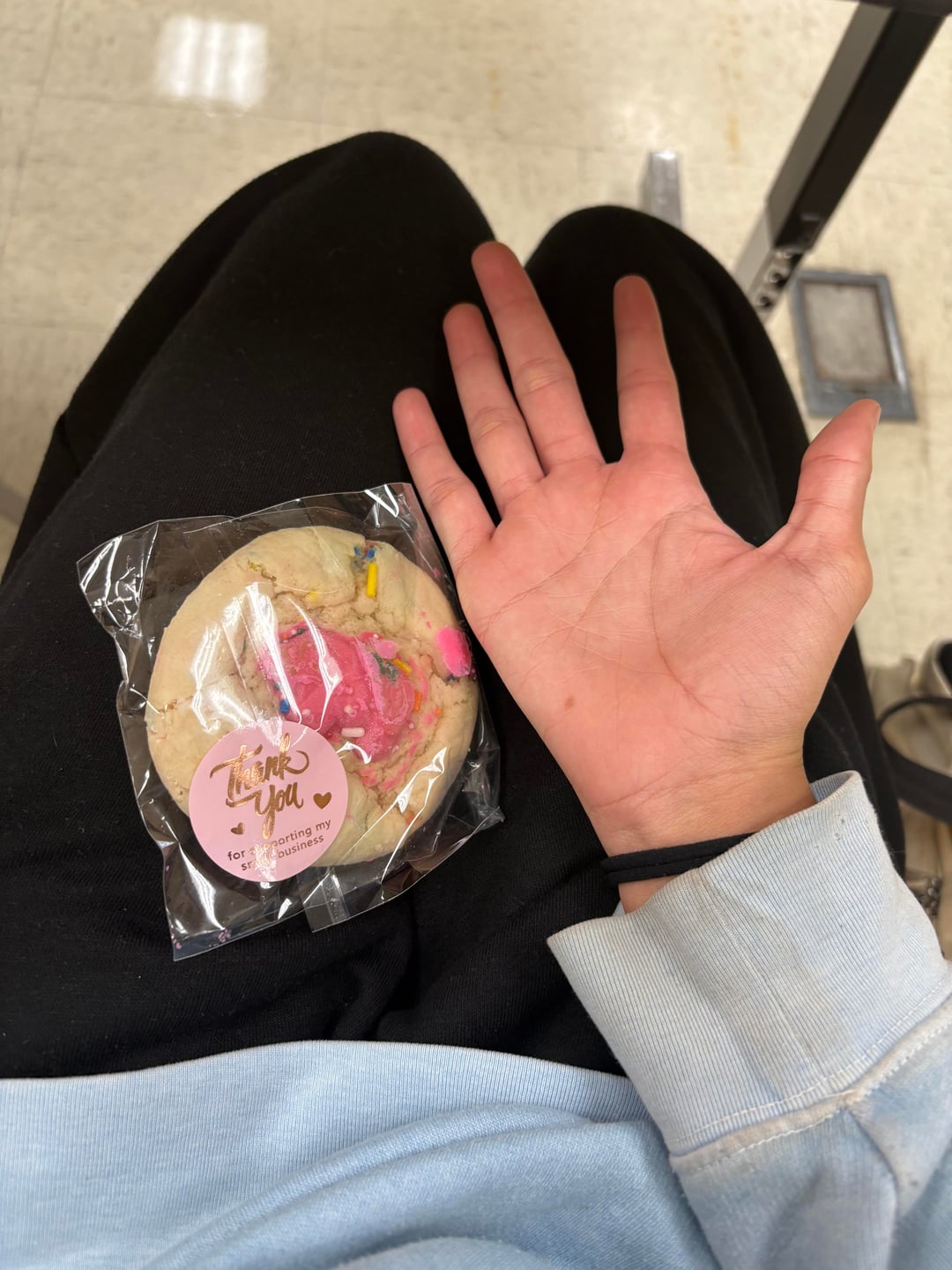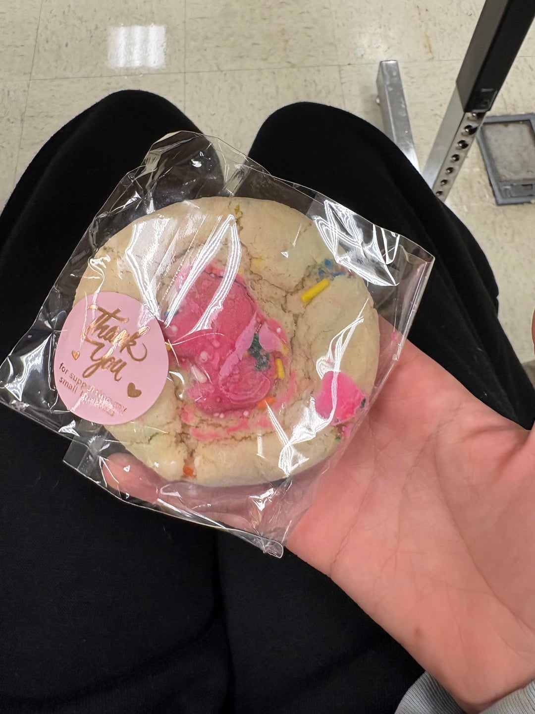 It’s a funfetti cookie with a circus animal on top. That’s how big it is compared to my hand