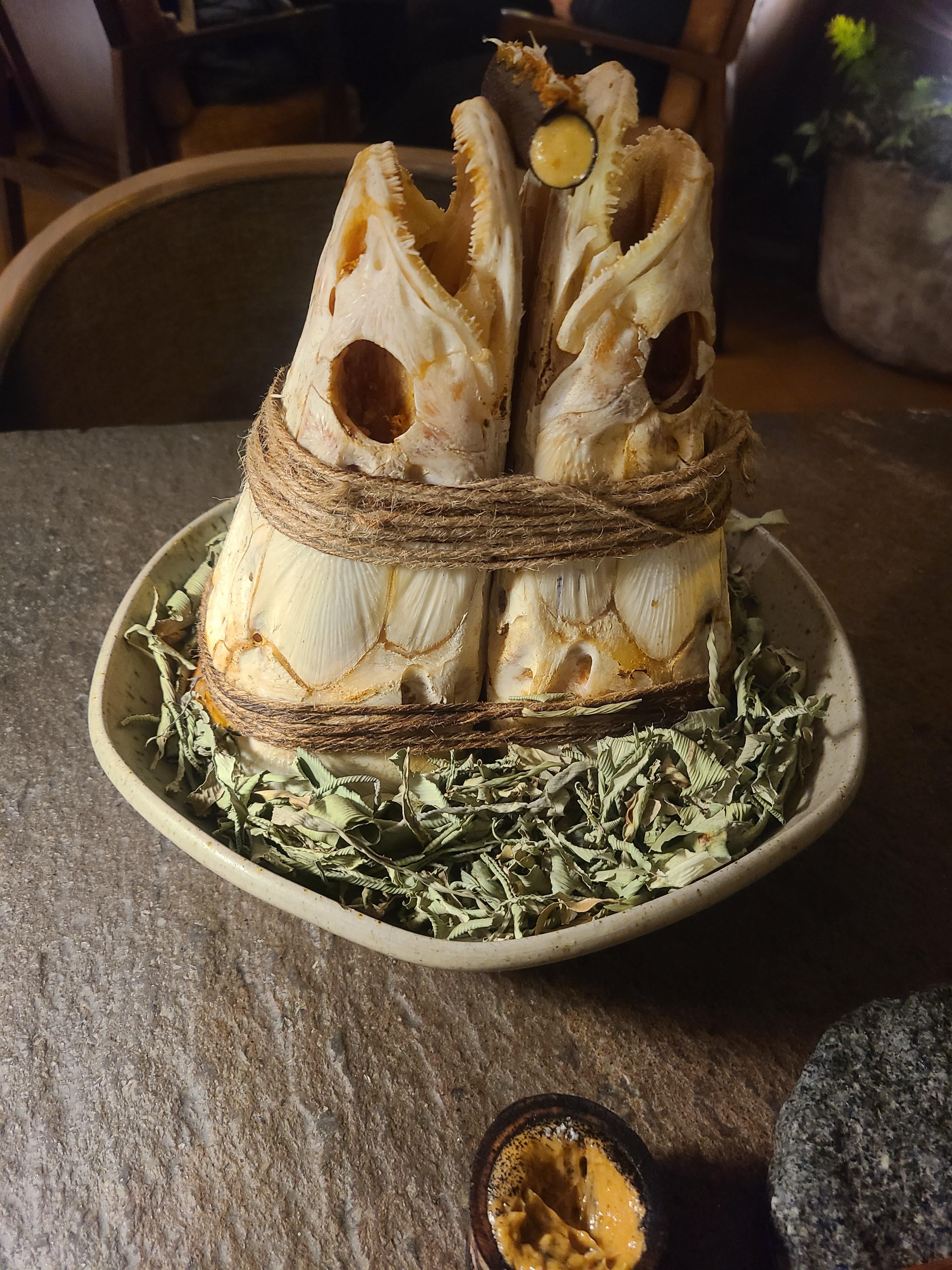 I understand the edible part is the thing nestled between the chins of the fish skulls (what a sentence), but what is it? I can’t identify a single ingredient. And that dip in some kind of..shell? A shell of what I’m not sure, it could be a sea creature or a nut shell. And it looks like it’s already been dipped into?