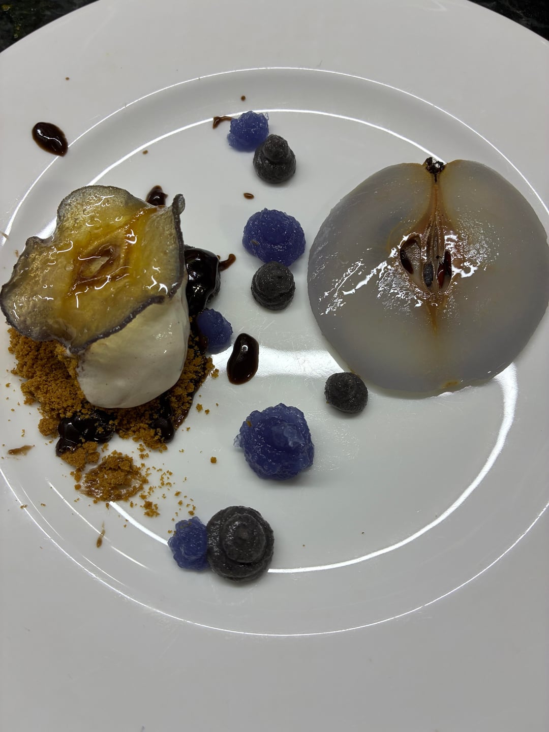 Personally, I’d reimagine it to have the pear on the right be the bottom, fill in the seed pocket with your biscoff, add the black sesame paste around the hole to “seal” it, vanilla quenelle, and then your glass pear on top. Basically stack it and it’ll be more refined. Correct your gelée, and you can draw a nice design on the plate, or get better dots. I’d add a butterfly pea flower to the top of the dessert or on the side of the plate with the gelée design.