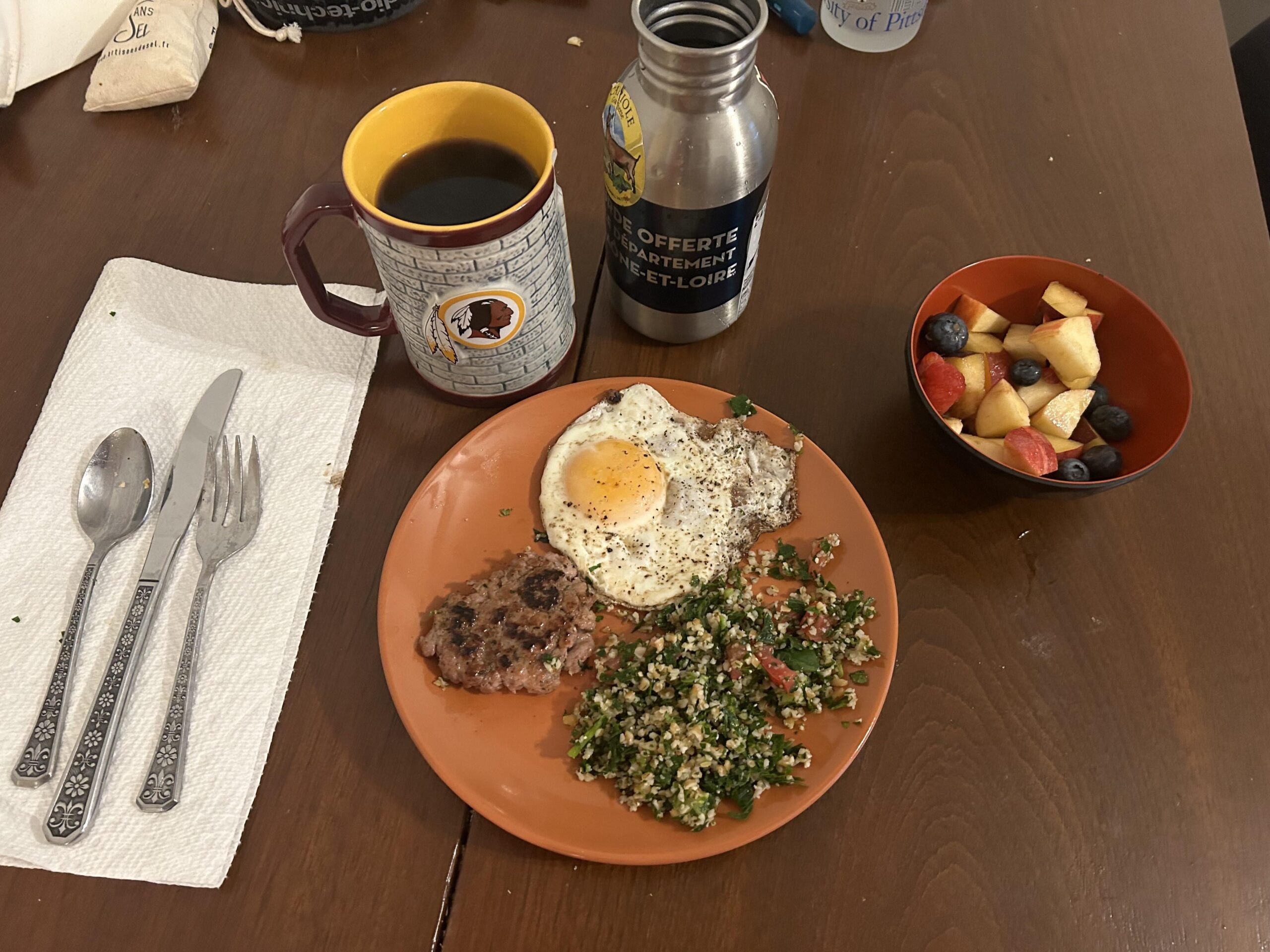 Patty made out of a sausage mix I’d made for pigs in a blanket, fried egg, tabbouleh, fruit salad