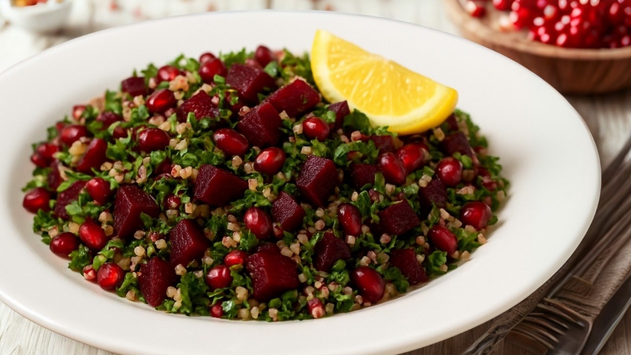 Today we’re making one of the most popular Middle Eastern salads, tabula. But not just any tabula. This one has a fun twist. It is sweet, tangy, and absolutely delicious. We’re making beetroot tabula. Start with two beetroots. Peel them, then cut into small cubes. Cutting them small helps them cook faster. And since we want it cubes anyway, so I’ll just cut it from now. Just like that. Try and get them as small as possible. Place the cubes in a deep pot. It is better to use a deep pot for this so that the water doesn’t splash out and make a mess in your kitchen. And trust me, it won’t make a mess if the pot is not deep enough. Now, cover with water and bring it to a boil. [Music] Once it boils, lower the heat to medium and cook until tender. You will need from 20 to 25 minutes or until it is tender and you can insert a fork in it and it slides in easily. Once ready, drain and set aside. Traditional tabul is made with bular, but for this twist, we’re using quinoa. In a pot, combine half a cup of quinoa with one cup of water. Bring to a boil, cover, then reduce the heat and let it simmer for 10 to 15 minutes until fluffy and tender. For quinoa, you always need to double the amount of water. So, if you are using half a cup of quinoa, you will need 1 cup of water. If you’re using one cup, for example, you will need two cups of water. Once cooked, fluff with a fork and stir in 1 tbsp of olive oil and 1 tbsp of lemon juice. Set it aside and let it cool down. Now we will start preparing the rest of the ingredients. Finally, chop a whole bunch of parsley. Just like traditional tabula, it heavily depends on parsley. To save time, you can do this step and chop your leaves while working on the beetroot and quinoa. But I just wanted to show you a step by step. [Music] Then chop a few leaves of mint. This will add freshness and brighten up the salad. You can also do scallions here if you have some. We have our parsley and mint finely chopped, our beetroot boiled and drain of any excess water. And our quinoa completely cooked. Now let’s work on our dressing. For the dressing, whisk together a juice of half a lemon, a pinch of salt and pepper, 2 tablespoons of pomegranate molasses, and lastly, 2 tablespoons of olive oil. So quick and easy. That is it. Whisk it all together just to make sure that everything is combined together. In a large bowl, add your parsley and mint and then the quinoa. Mix them together. Next, add the beetroot cubes. Set a few to use as a garnish on top. And that is of course optional. [Music] Now, sprinkle in pomegranate seeds. I like to add half inside and then use the rest on top along with the extra beetroot cubes. For some reason, my pomegranate is kind of light color. I thought it was not fully ripe, but it turned out it was just like regular ones. Anyways, pour in your dressing and toss everything together. Then finish with the garnish on top. This salad looks beautiful and it tastes even better. You can enjoy it right away or let it chill in the fridge for 30 minutes to 1 hour. If you like this twist on tabula, give this video a like. And if you would like me to share with you an authentic version of tabula, let me know in the comments. Don’t forget to subscribe so you don’t miss any of my new recipes. I upload twice a week. Thanks for hanging out with me today and I’ll see you in the next one. Bye-bye.