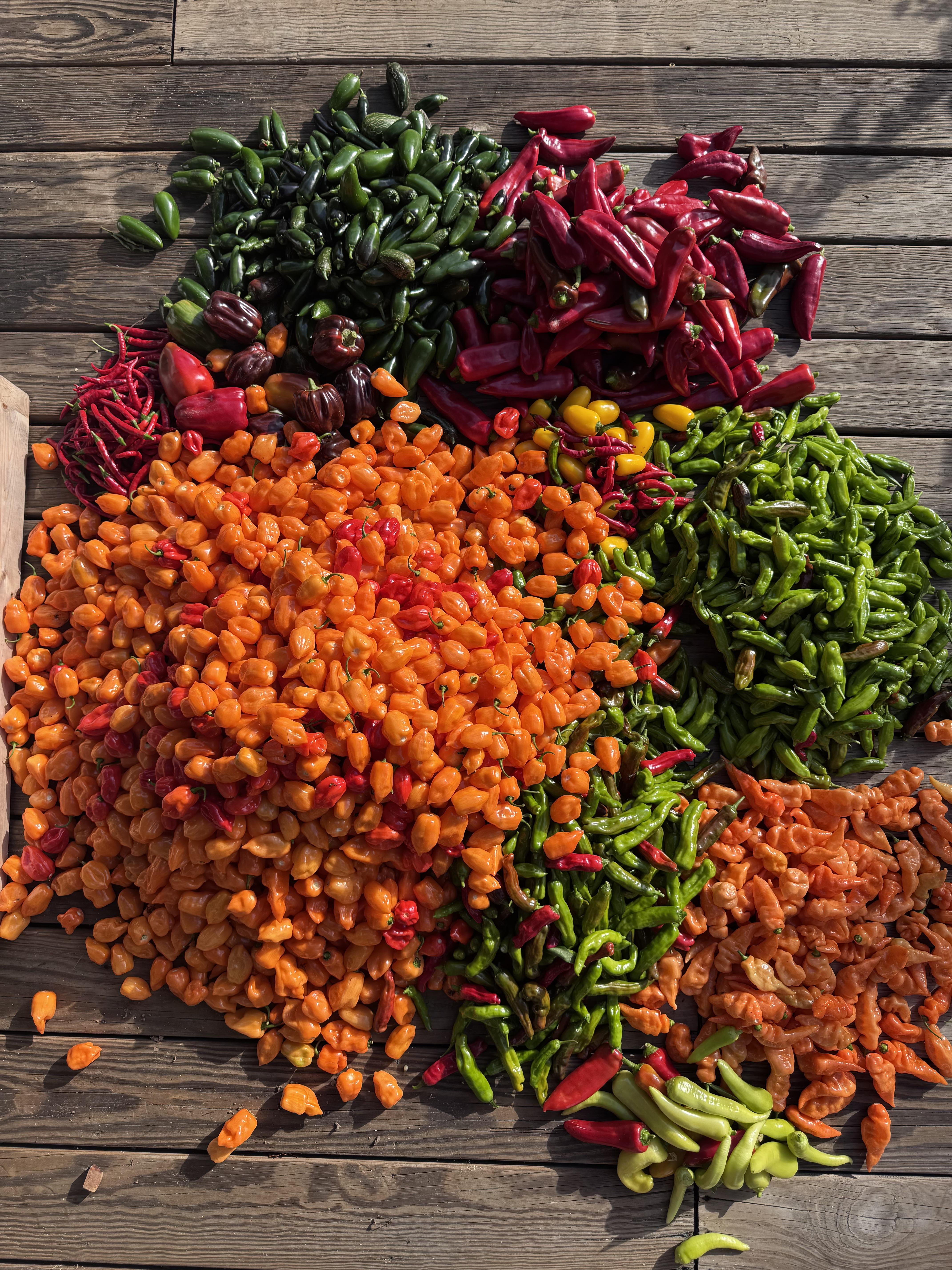 All the habaneros are going to Hotsauce. Jalapeño to pickling. Bananas to grilling. Habanada to experimenting. Shishito to grilling and friends. Thai to mash. Hatch to beats me.